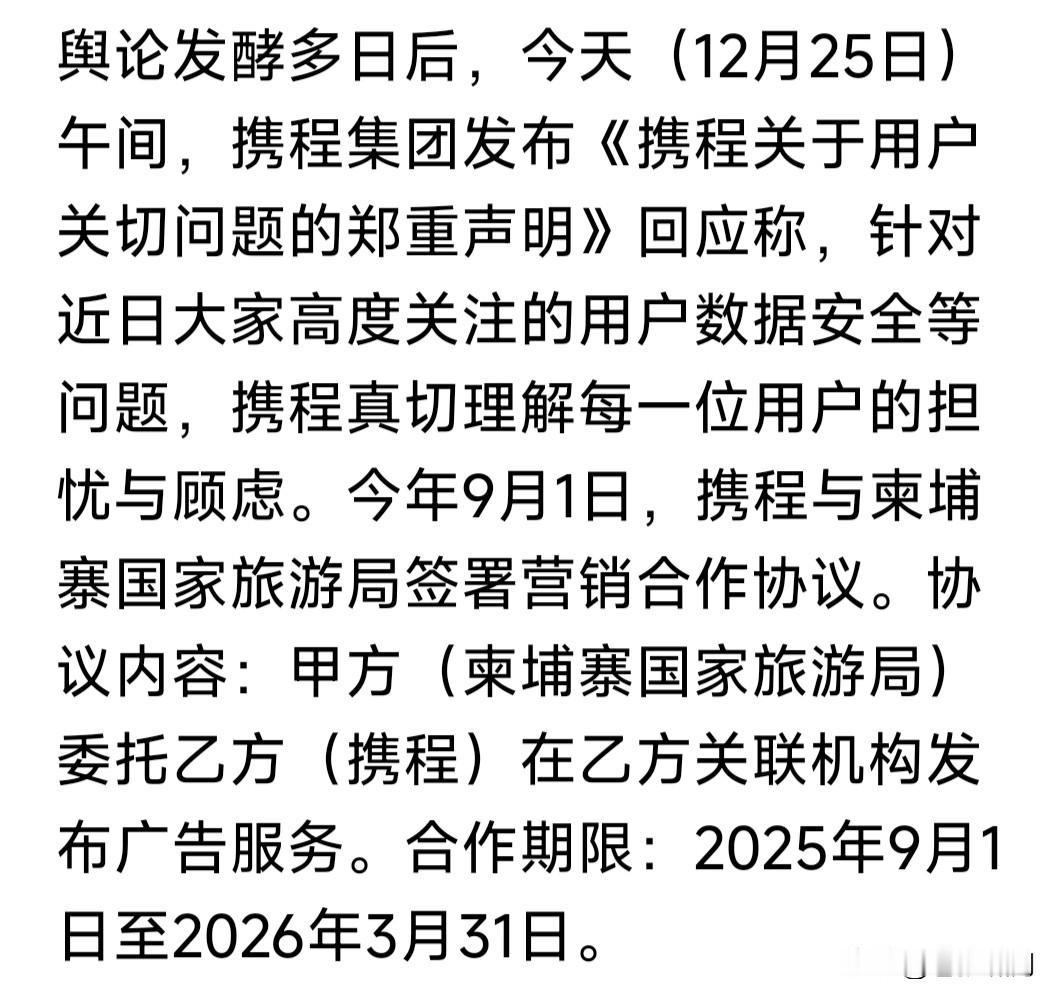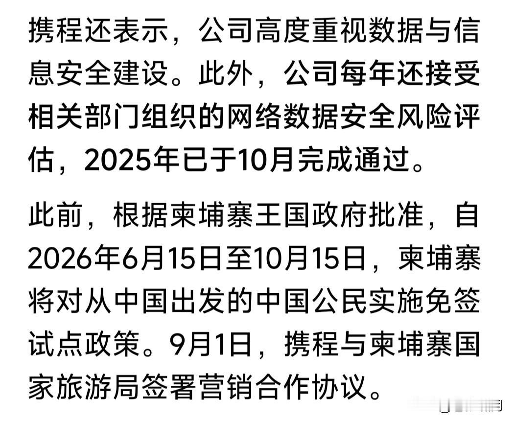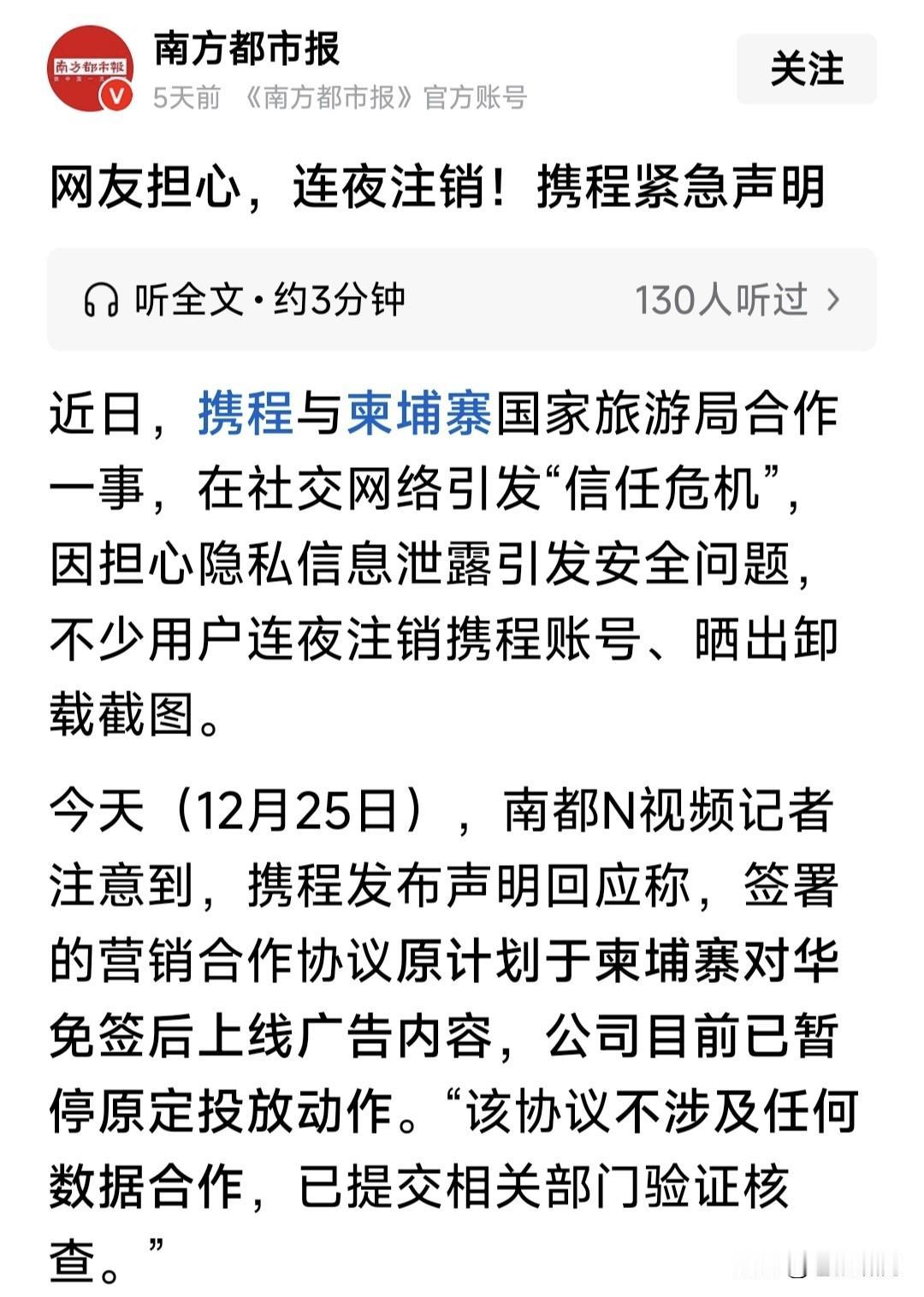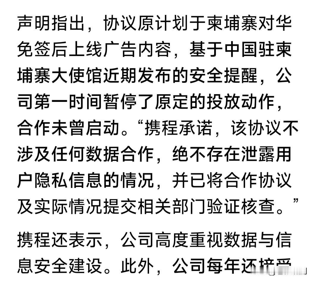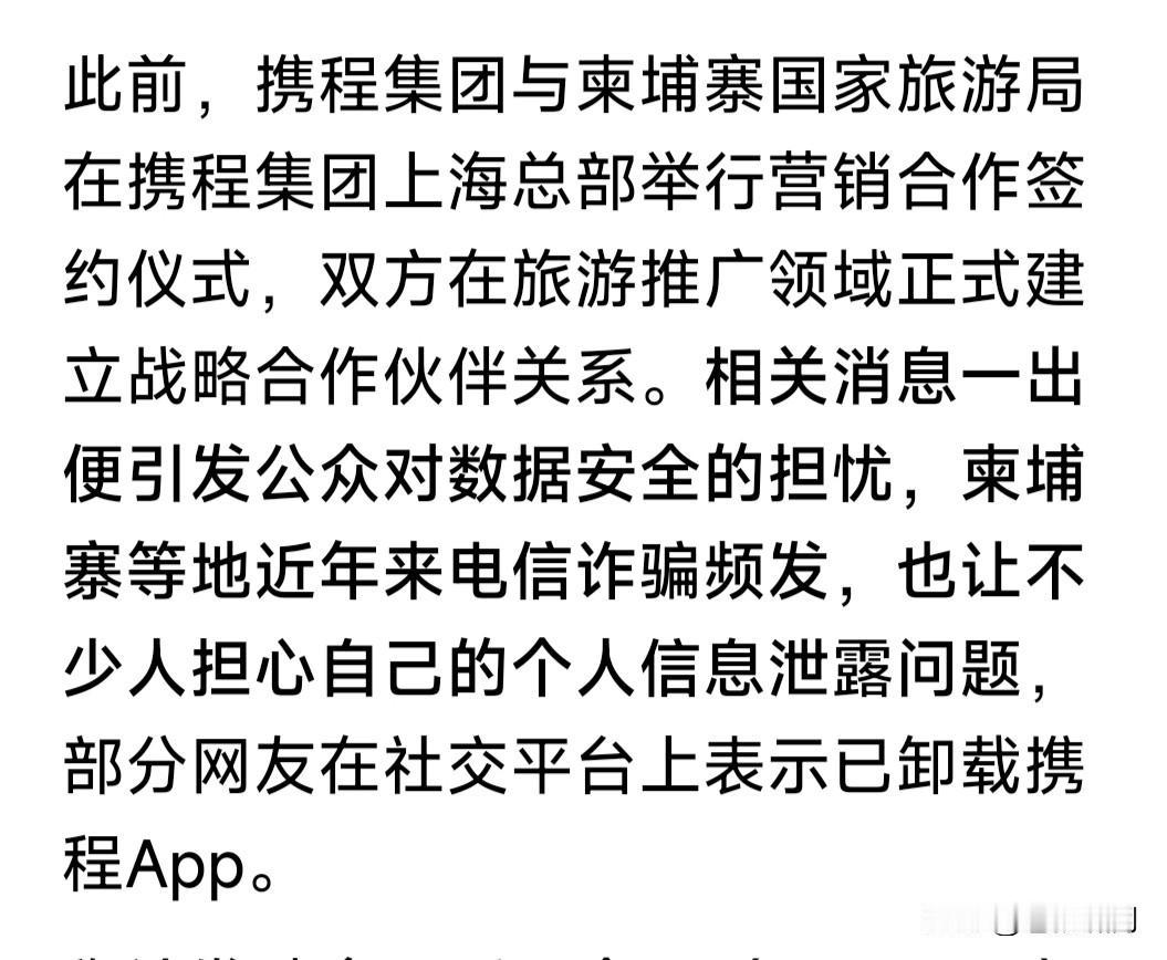 300万人卸载,引发信任危机?“携程”发表紧急声明:停止与柬埔寨旅游局战略合作,暂停柬方广告投放业务。 回顾事情来龙去脉,感觉费思量。近年缅柬泰网诈泛滥,引发各国警惕。柬埔寨竟宣布2026.6对中国游客免签。 携程看准商机,与柬旅游局签订合作协议:待柬对中国游客免签后,柬旅游局可在“携程网”进行广告投放业务。 谁知时隔不久,泰柬发生边境冲突。泰方声称打击柬埔寨网诈活动,并摧毁对方数个诈骗园区,一时震惊世界。 中国驻柬使馆发出通知,提醒中国公民近期不要去柬旅游,已去者立即转移安全地区,远离战火确保人身安全! 是泰柬冲突影响?还是反感柬缅网诈团伙?因此知道“携程”与柬旅游局签约合作后,出现不少人卸载“携程”呢? 有人爆料:已有300万人卸载“携程”!苍狼不知确实数字,但肯定不会太少。不然“携程”也不会紧急声明,终止与柬旅游局合作,暂停他们广告投放吧? 这件事情再次说明,人民群众信任的重要性!希望“携程”通过努力,能够及时止损,渡过信任危机,恢复民众信任,重现往日辉煌,再创业务佳绩! …………