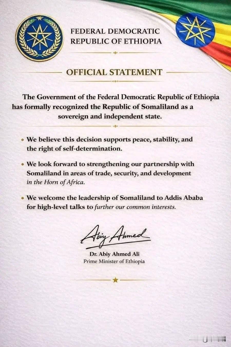 继以色列之后,埃塞俄比亚已正式承认了非洲乃至全世界最新的国家索马里兰……尽管遭到了名为非洲联盟的、最无用的反非洲进步组织的拒绝。 预计非洲将有更多新国家获得承认,它们可能源自喀麦隆的安巴佐尼亚和尼日利亚的比亚夫拉 。让我们密切关注发展。