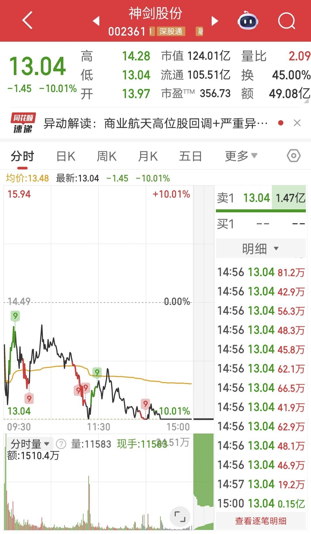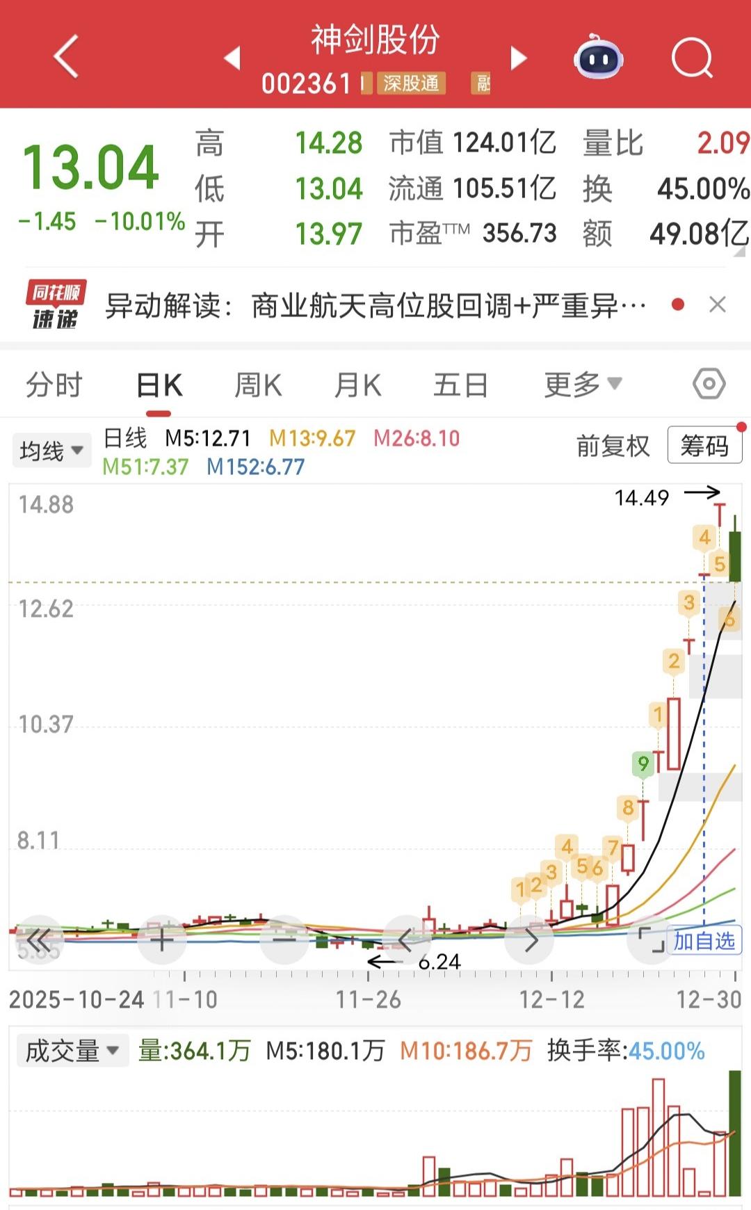 章盟主摁掉1.2个亿: 今天8板神剑股份断板直接跌停。 盘后龙虎榜显示章盟主摁掉1.2个亿。 从之前披露的龙虎榜数据来看,他应该是25号建仓的,今天清仓能带走10个点左右。 游资