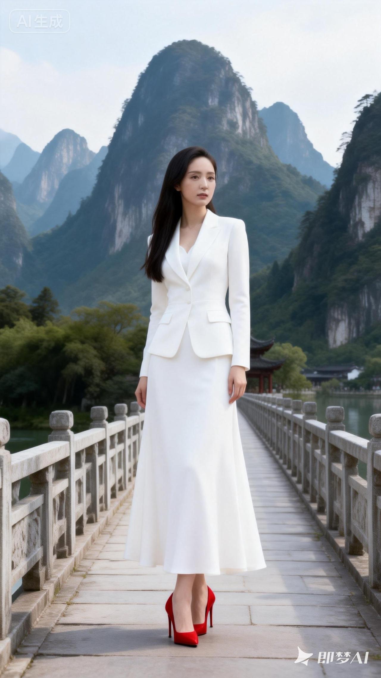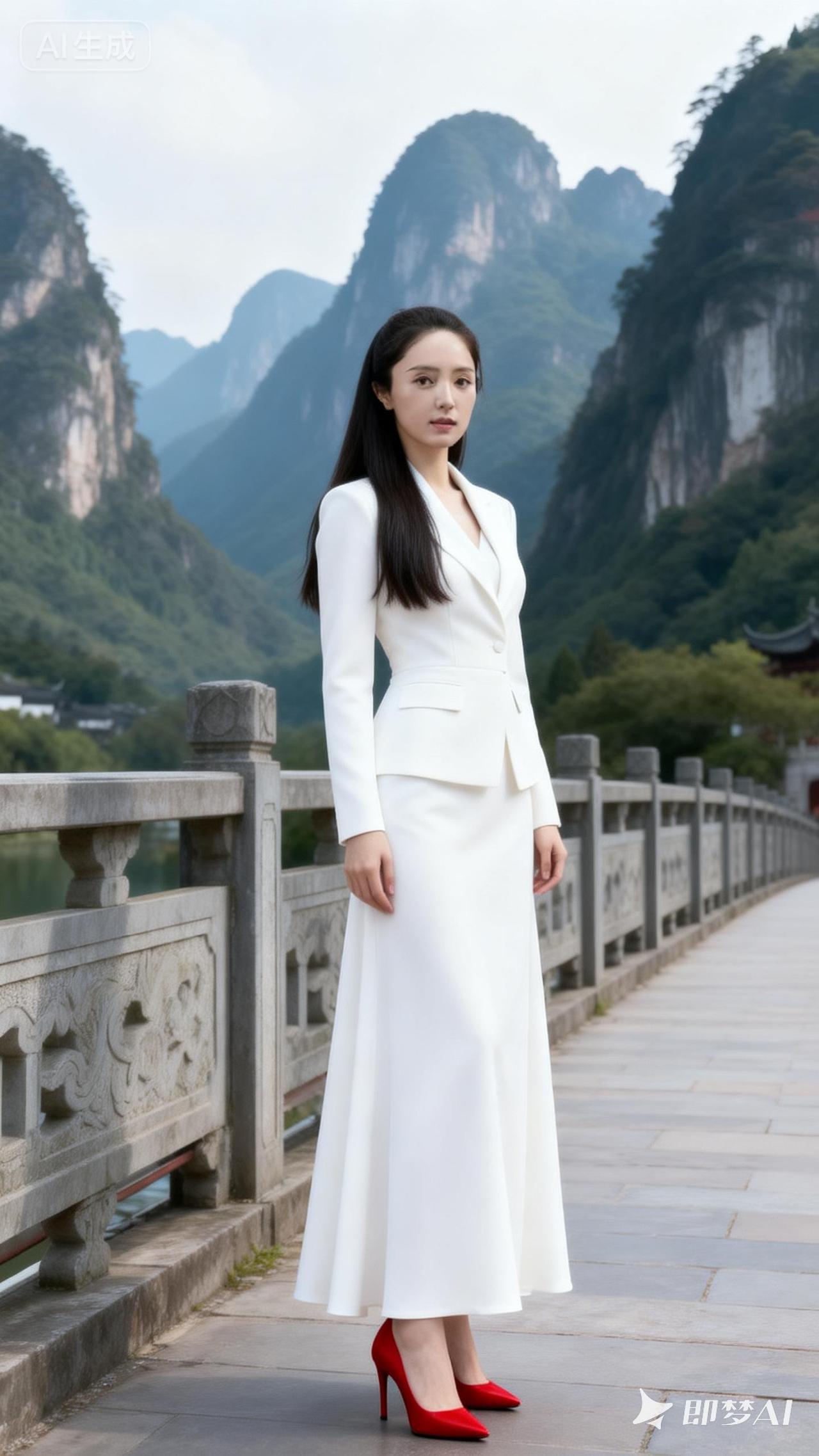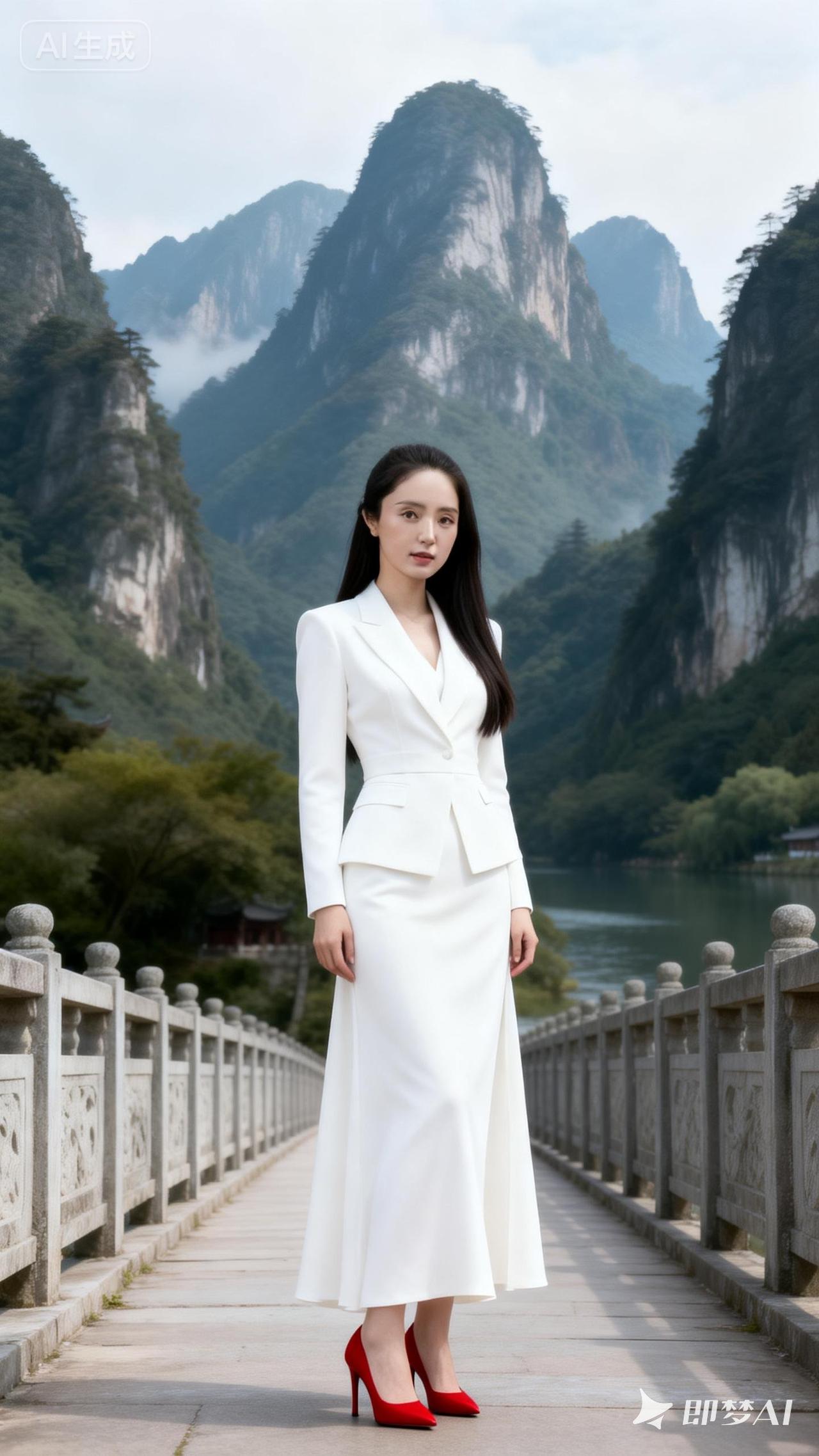 白衣飘飘,红鞋点缀,漫步山水间,尽显优雅风姿。