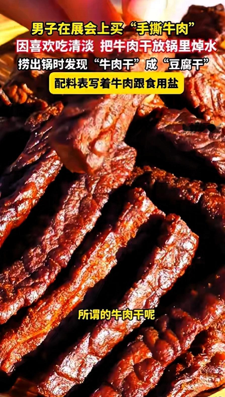 谁说手撕牛肉里面一定要有牛肉的,老婆饼里也没老婆,鱼香肉丝里也没鱼啊! 据媒体报道,12月28日,湖南一男子在展会上买了75元一斤的“手撕牛肉”,因喜欢吃清淡,把牛肉干放锅里焯水,捞出锅时发现“牛肉干”成“豆腐干! 有网友调侃:“没错啊!牛肉味道的豆腐干”!也难怪,花75元一斤,能买到真牛肉干吗?能买到真豆腐干也就不错了,没让你买到“科枝与狠活”就烧高香吧!