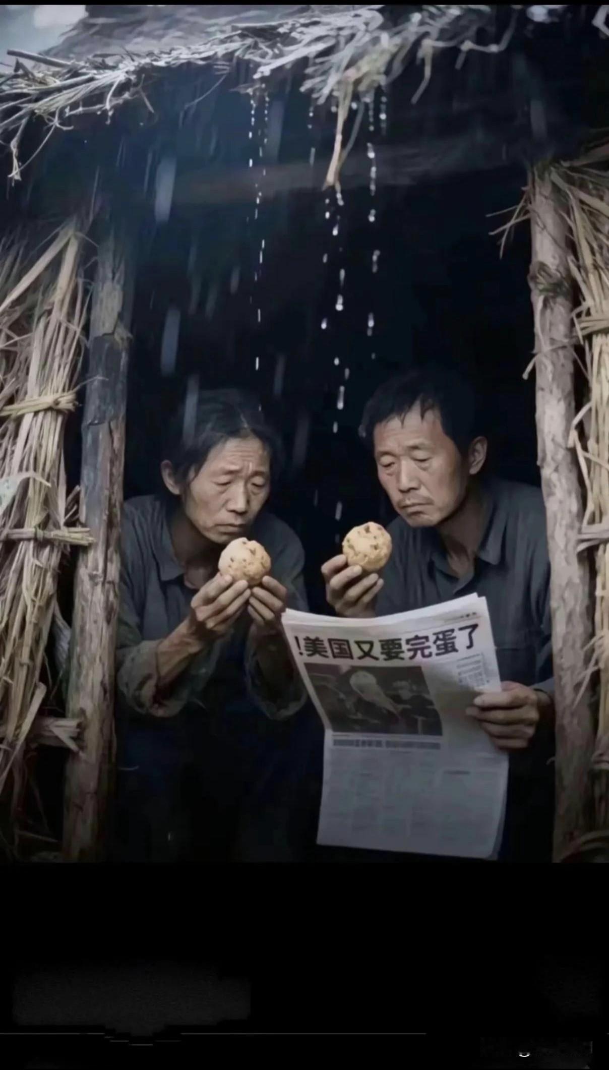看到这张图,让人心里疼!两个老夫妇,蜷居茅屋棚;房顶露着天,漏雨水涟涟。手拿窝窝头,粗粝难下咽;不忘看报纸,美帝要完蛋! 想起小时候,当年就这样!打倒美国佬,越穷越革命;自己饿肚子,援助亚非拉!喂了多少白眼狼?现在想起来,我们应当引以为戒啊! …………