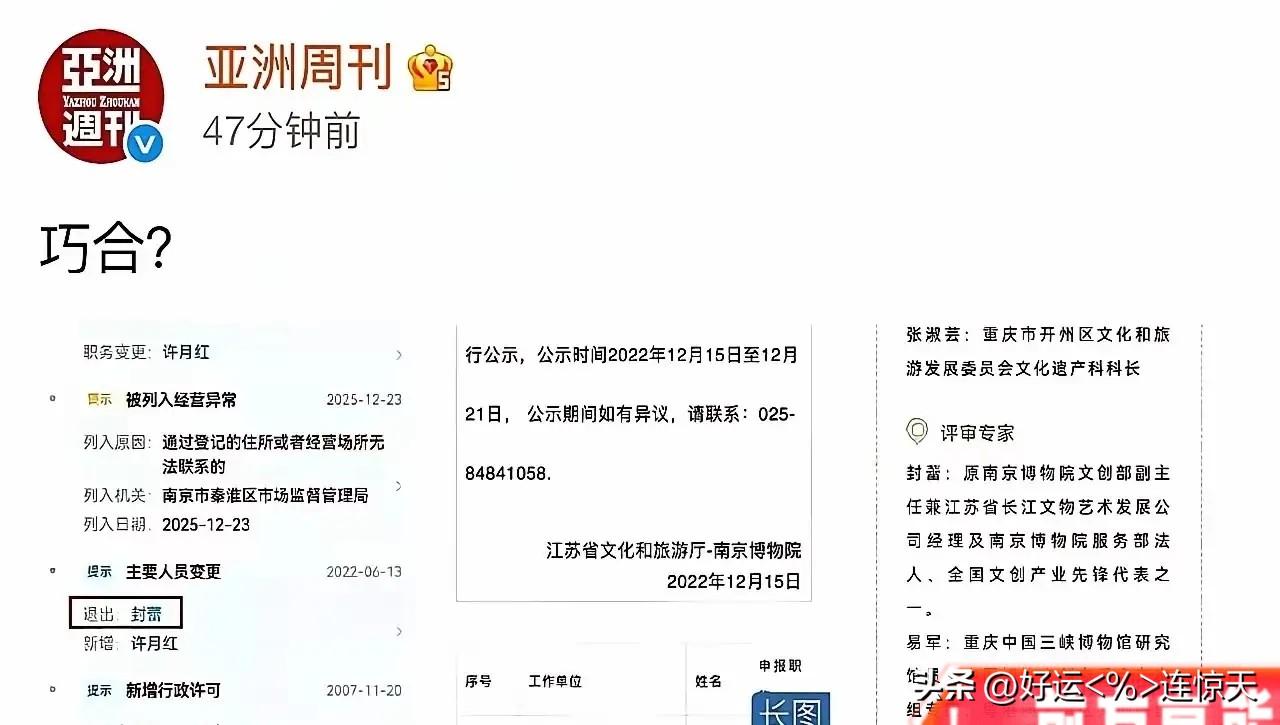 这回《亚洲周刊》是真没打算留后路,直接把桌子掀了。 又扒出来个猛料:南京博物院有个馆员叫封某,嘿,巧了,南京敏求艺术拍卖公司的合伙人也叫这名儿。 同名同姓,你以为这只是撞名那么简单?太天真了!这个封某根本不是普通馆员,而是南京博物院文创部副主任,还兼着院服务部法人、长江文物艺术发展公司经理。这哪是身兼数职,分明是把国家文博资源当成自家生意版图来圈!文创部管着馆藏文物的衍生开发,服务部握着场馆经营的实权,长江文物艺术发展公司本身就涉及文物相关业务,再加上拍卖公司合伙人的身份——从藏品保护、文创转化到商业拍卖,整条产业链都被他攥在了手里,这操作简直把利益捆绑写在了脸上。 稍微懂点规矩的都知道,2018年修订的《公务员法》就明确禁止公职人员,从事或者参与营利性活动,在企业或者其他营利性组织中兼任职务,而《文物保护法实施条例》更是直接卡死了文物收藏单位的工作人员不得参与文物商业经营活动的红线。南博作为副省级事业单位,其工作人员的行为规范比普通公务员还要严格,封某顶着三个公职头衔还去当拍卖公司合伙人,这已经不是踩线,而是明目张胆地越界。 封某所处的文创部,本是让文物活起来的关键部门,可一旦和拍卖公司挂钩,性质就彻底变了。南博馆藏的明清书画、民国玉器,随便一件的文创授权费都是天文数字,而这些藏品的细节、品相只有内部人员才能精准掌握——拍卖公司拿着这些独家信息去包装拍品,溢价空间能翻好几倍,背后的利益分成可想而知。更可怕的是,长江文物艺术发展公司本身就有文物经营资质,这意味着封某完全可以通过内部流转的方式,将馆藏资源变相输送到拍卖市场,神不知鬼不觉地完成利益变现。 文物不是私产,博物馆更不是个人的摇钱树。南京博物院里那些青铜器上的铭文、古画里的笔墨,都是祖先留下的文明密码,是无数考古工作者、文物保护者用毕生心血守护的财富。封某身兼数职却跨界营利,不仅违背了公职人员的初心,更触碰了文物保护的底线。现在《亚洲周刊》把这层窗户纸捅破了,相关部门必须一查到底,查清他的多重身份是否合规、背后有没有利益输送链条、是否存在馆藏资源流失的情况。别让博物馆的公信力毁在少数人的私心手里。文物保护容不得半点含糊,对这种跨界捞金的行为必须零容忍!