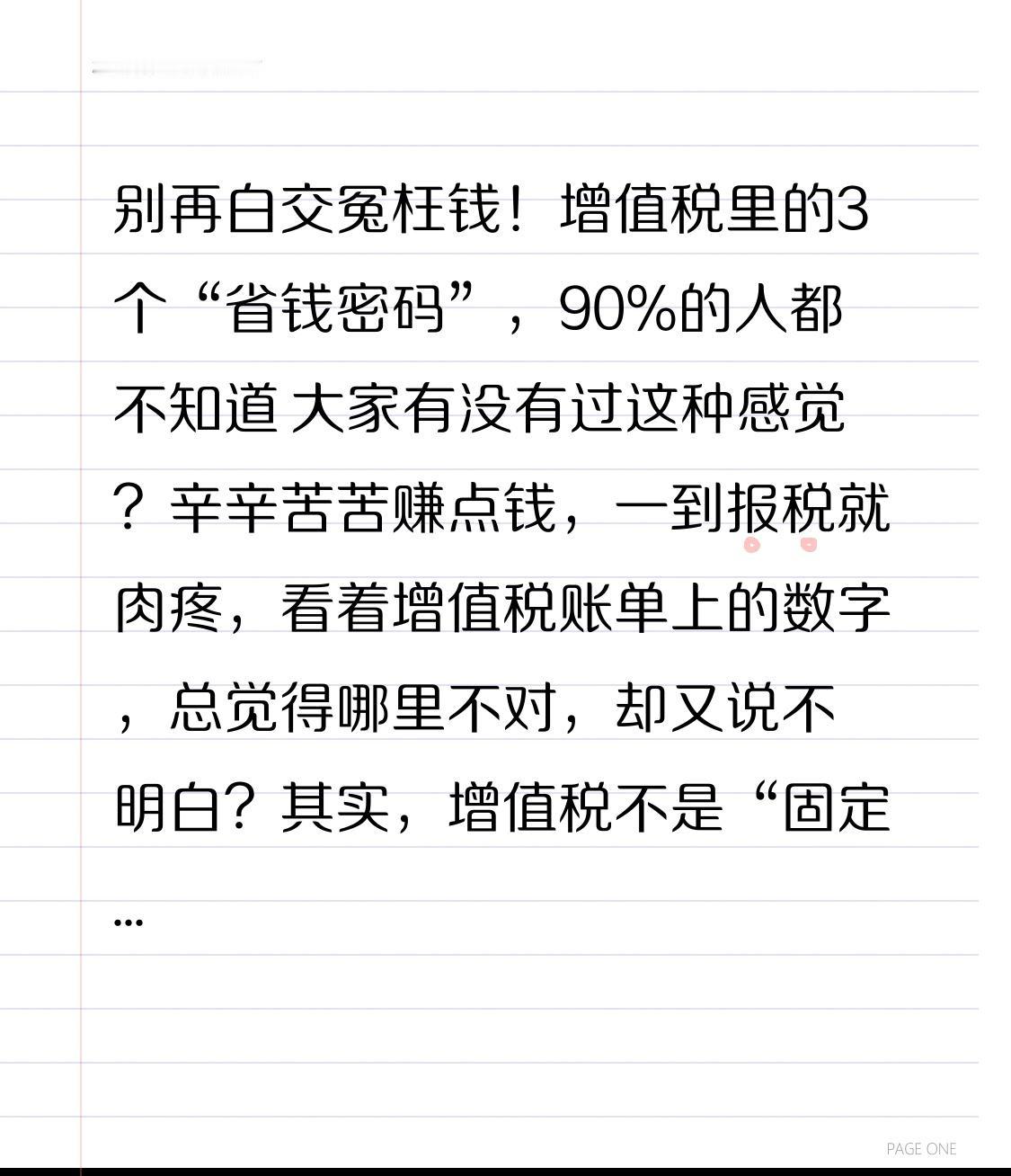 别再白交冤枉钱!增值税里的3个“省钱密码”,90%的人都不知道 大家有没有过这种感觉?辛辛苦苦赚点钱,一到报税就肉疼,看着增值税账单上的数字,总觉得哪里不对,却又说不明白?其实,增值税不是“固定税”,里面藏着很多普通人不知道的门道,学会了能少交一大笔冤枉钱! 说到增值税,很多人第一反应就是“复杂”“看不懂”,觉得那是公司老板才需要操心的事。但其实,增值税和我们每个人都息息相关。你去超市买东西,价格里含着增值税;你网上购物,商家开票时也会标注增值税;甚至你给别人打工,公司的增值税缴纳情况,也可能间接影响你的收入。 但很多人都走进了一个误区,觉得增值税就是“按营业额乘以税率”,只能硬着头皮交。其实不然,这里面有个关键转折点——增值税的“进项抵扣”。简单来说,就是你在经营过程中花出去的钱,只要取得了合规的增值税专用发票,就可以用来抵扣你需要缴纳的税款。 举个接地气的例子:小明开了一家小超市,这个月销售额10万元,税率13%,按照常理他需要交1.3万元的增值税。但如果他这个月进货花了6万元,并且拿到了合规的专用发票,那么这6万元对应的0.78万元税款就可以抵扣,他实际只需要交0.52万元。这一下就省了一半多的钱! 除了进项抵扣,还有很多“省钱小技巧”。比如,小规模纳税人可以享受“季度销售额30万元以下免征增值税”的优惠政策;如果你是小微企业,还能享受税率减免。这些政策不是摆设,而是国家给大家的“福利”,但很多人因为不了解,白白错过了。 很多人觉得“报税是财务的事,我不用懂”,但其实,了解基本的增值税知识,不仅能帮你省钱,还能避免踩坑。比如,有些商家会以“不开票便宜点”为由,让你放弃索要发票,看似你当时省了一点钱,实则是帮商家逃了税,而你自己也失去了抵扣的机会,最终还是亏了。 增值税看似复杂,其实只要掌握了基本逻辑,就会发现它并不难。国家出台这些税收政策,不是为了“为难”大家,而是为了调节经济,帮助企业和个人更好地发展。希望大家都能主动去了解增值税知识,不再白交冤枉钱,把更多的钱用在自己和家人身上。 你对增值税还有什么疑问?