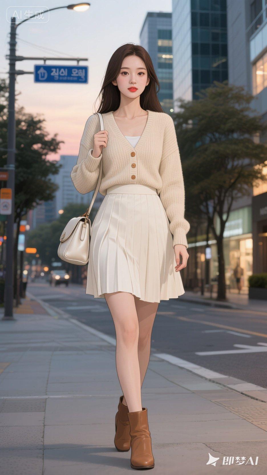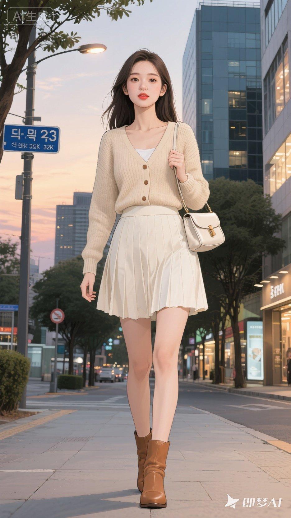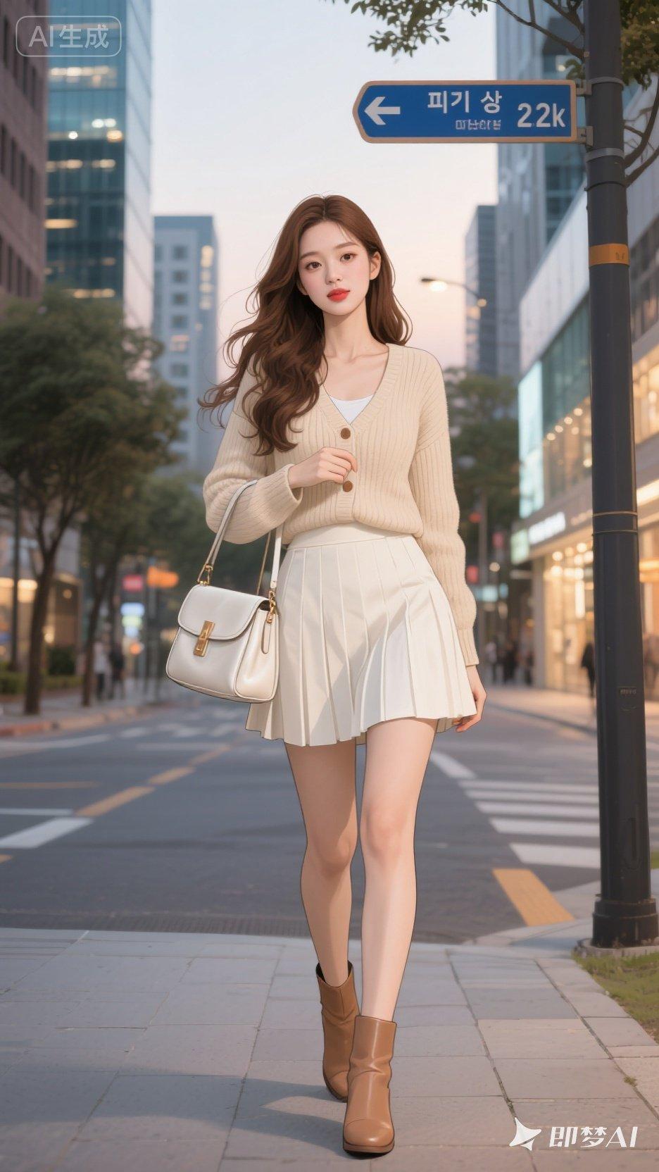 都市时尚美女穿搭,粉色格纹短裙搭配红色上衣,手提包和运动鞋完美搭配!有点肉肉有美