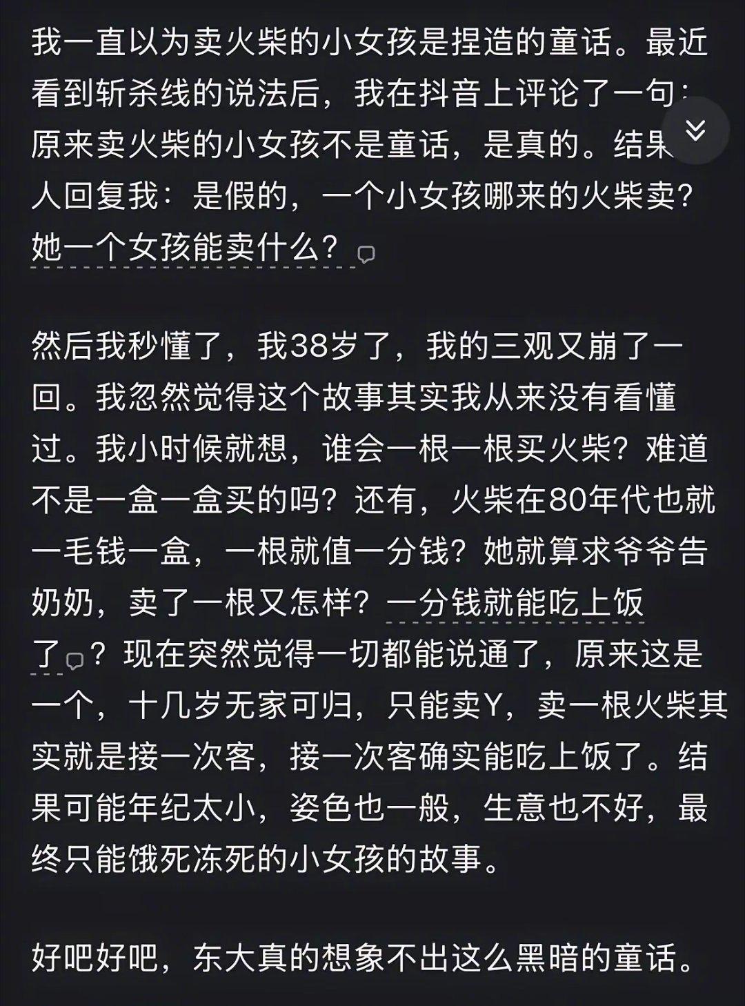 原来我们一直都没有看懂《卖火柴的小女孩》,原来我们调侃的“卖女孩的小火柴”,不是调侃,而是真相,原来小女孩卖的不是火柴,卖的真是小女孩。 以前我们不了解美国斩杀线,我们看外国总是带着一层美好的童话滤镜,知道美国斩杀线以后,很多事情一下子就恍然大悟了。