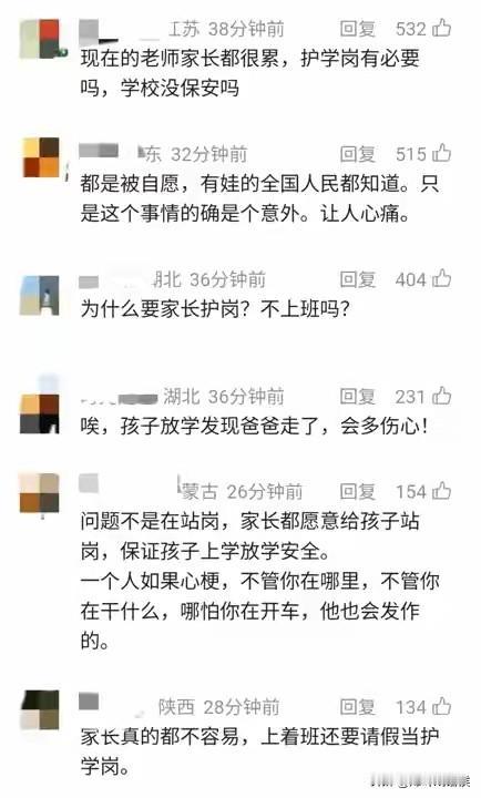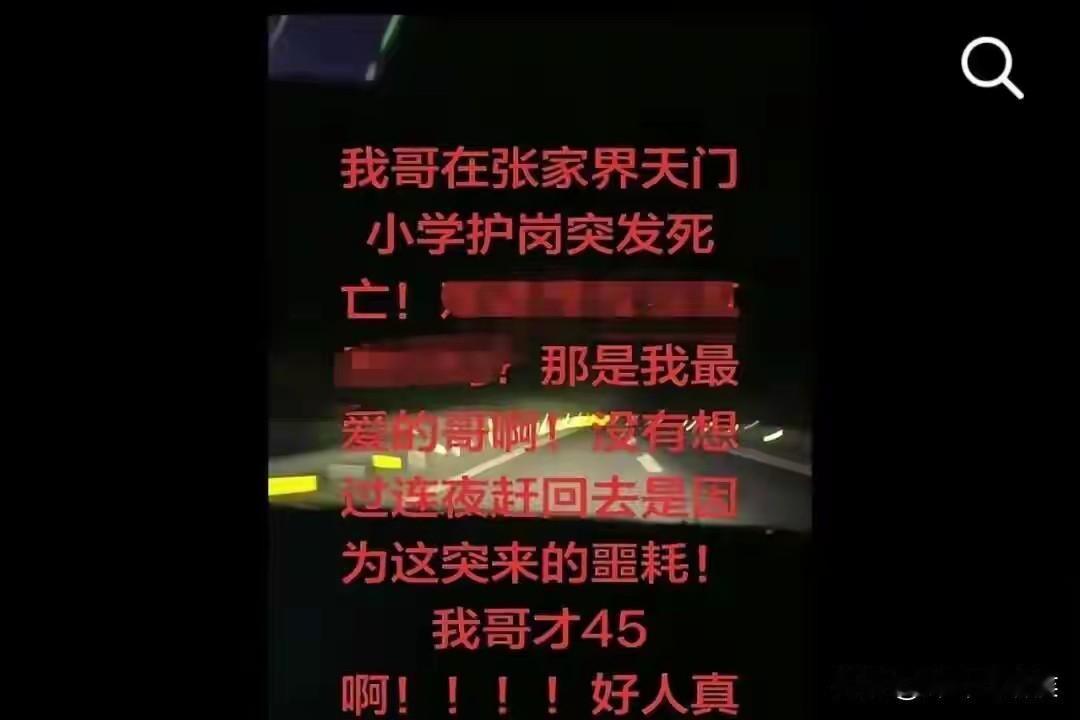怎么也不会想到,“护学岗”会因为一位家长的晕倒身亡,而被大家热议。近日,张家界一小学门口发生了令人痛心的一幕,一家长意外去世,站岗才2分钟。 这位家长还很年轻,仅仅只有45岁,家中有两个孩子,大孩子17岁,小孩子上小学三年级,当天轮到他在小学门口护学站岗。 据知情人回忆,他当时去接孩子时,就已经看到男子晕倒在地了。 据来的早的家长说,男子才站岗2分钟就晕倒了,当时孩子们还没有开始放学,但就是这突如其来的一幕,也让现场的家长们愣住了原地。 这个男子年纪并不大,他又怎么会晕倒的? 不少接孩子的家长,一边围观,一边在窃窃私语,虽然意识到男子的身体状况不好,但怎么也没能想到,他会因此而死亡。 死者一位家属在网络发文怀念,虽然只有寥寥数语,却也能体会到家属的痛楚和无奈,感叹世事无常的同时,留下的两个年幼孩子,他们的未来又该怎么办? 父亲没了,家里的顶梁柱没了! 当地教育局的工作人员回应,护学岗是家长自愿参加的,目前正在和死者家属协商此事。 其实,就个人而言,这名男子站了两分钟就晕倒,其实跟护学岗这个事,关系并不大,大概率他有什么基础病,护学岗只是站着,也不消耗什么体力,推测是心梗或者脑梗,才会出现抢救无效死亡的情况。 当然,以这种方式离开,确实是一个悲剧,但也纯属个例罢了。 说到底,还是因为他本身体质有些差! 大家觉得呢?