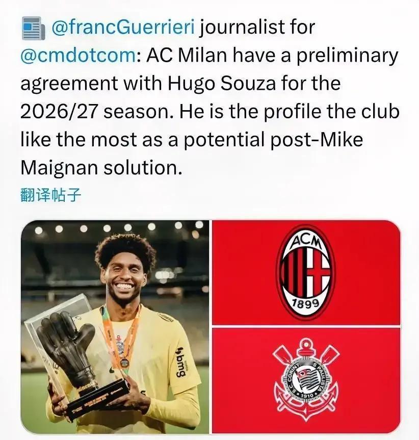 迈尼昂不续约,米兰已找好替身 25岁巴西门将雨果·索萨,身价800万,弗拉门
