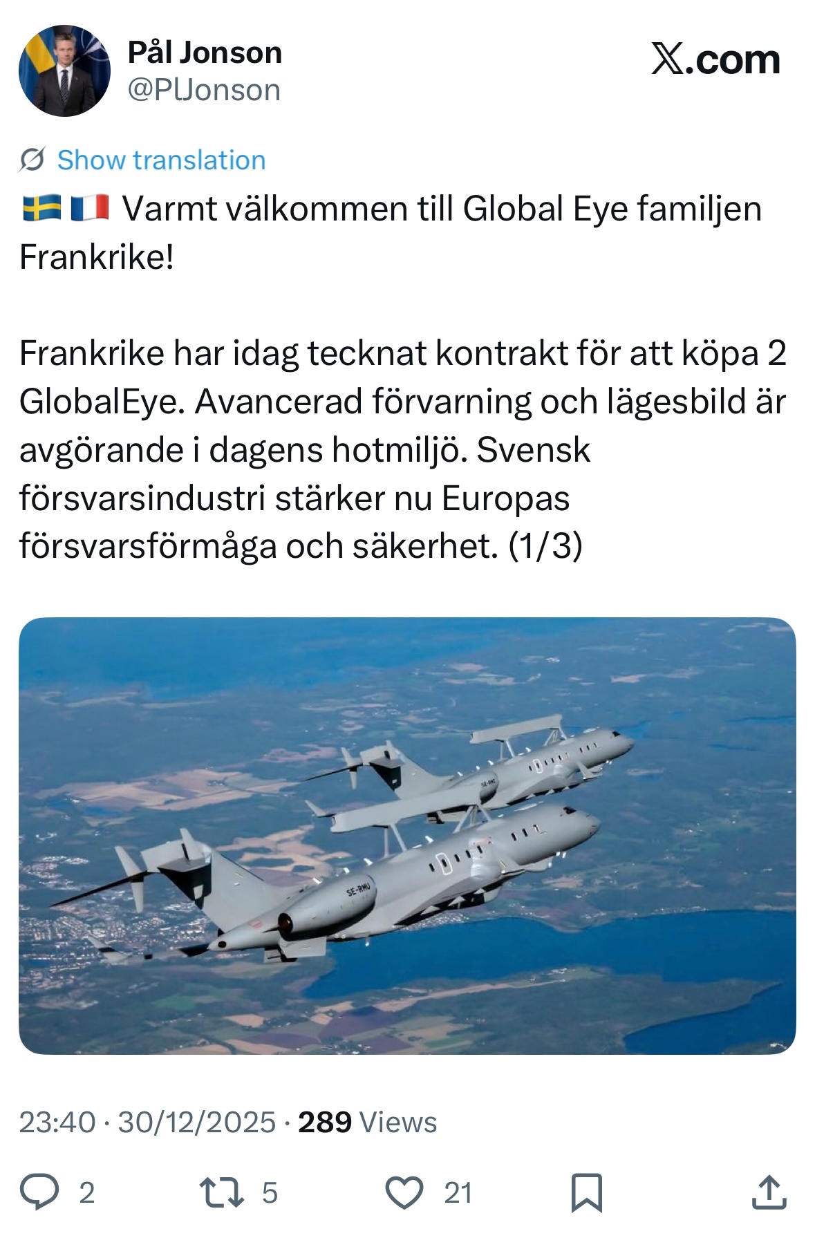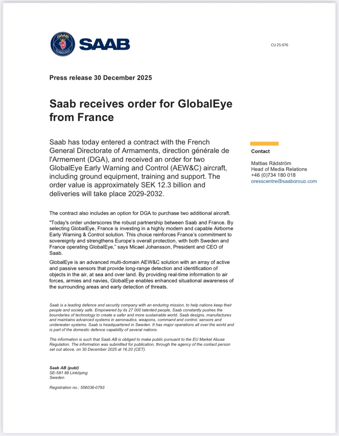 烽火问鼎计划 突发❗️法国🇫🇷和瑞典🇸🇪就法国🇫🇷空军采购瑞典🇸🇪萨博公司的“全球眼”预警机达成一致并签署✍️采购合同,2架+(可选2架),总价值约123亿瑞典🇸🇪克朗,计划2029-2032年期间交付。
