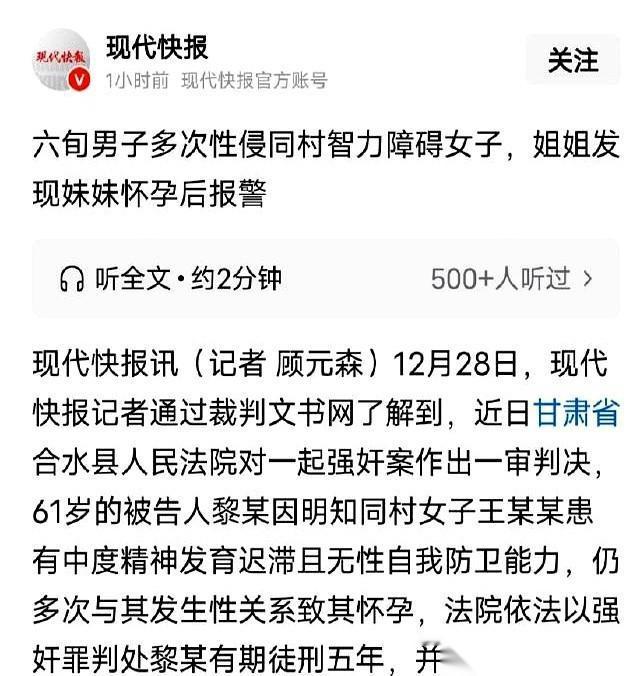 一个61岁的老头,把一个34岁、智力有障碍的女人,肚子搞大了。 四个月,在他家里,六次。 我看完这事儿,半天没缓过劲儿来,就觉得后脊梁骨发凉。 真的,有的人老了,不是变得更明白,是直接把那点仅剩的良心扔了。 搭个顺风车,就这么点功夫,那双贼眉鼠眼就看出来了,这个姑娘“好欺负”。 正常人看到弱者,是同情,是想拉一把。 他呢?他看到的是猎物。 他心里门儿清,这姑娘不懂得反抗,甚至可能都不知道发生了什么。 所以他才敢一次又一次。 这是作恶,更是彻头彻尾的懦弱和无耻。 最让我火大的是什么? 是他被抓了之后那句辩解:“她又没反抗。” 我真是……气得想笑。 她要是懂什么叫反抗,你这把年纪的老东西还能得逞? 不就是仗着人家没能力说“不”吗? 这不叫强奸,什么叫强奸?这是最恶劣的一种。 幸亏,她还有个姐姐。 是姐姐发现了不对劲,是姐姐报了警,是姐姐带着她去打掉那个本不该存在的孩子。 那一刻,这个姐姐心里该有多疼,多绝望。 最后判了5年,赔了4600多块钱。 说实话,看到这个数字,我愣住了。 四千六…… 一条命的代价?一个女人被毁掉的清白和尊严的抚慰金? 可能都不够她做一次手术、买几件新衣服、忘掉一场噩梦的。 有时候觉得,法律能惩罚罪恶,但真算不清人心里的账。 有些人坏,就是坏到了骨子里,跟年龄没半毛钱关系。