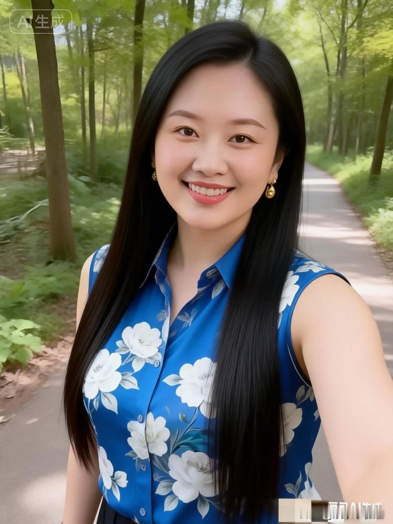阳光明媚的森林小径,微笑的姑娘,花衬衫与自然相映成趣。