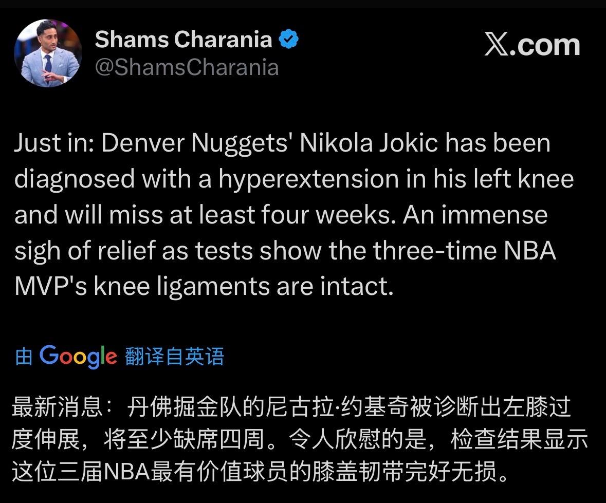 左膝过度伸展———约老师伤停至少4周恐无缘MVP评选! 还好无大碍,不过未来4周