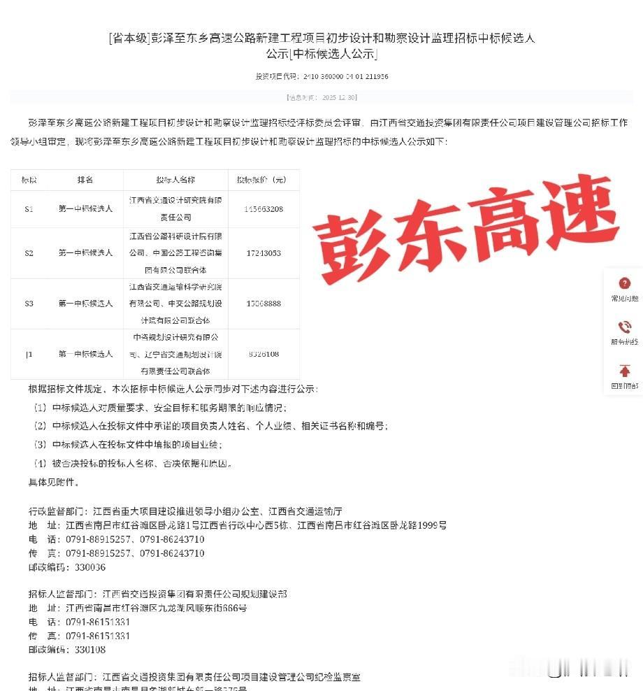 235亿!彭泽至东乡高速公路前期中标 彭东高速路线全长约173.5公里,项目估算总投资约235亿元。 标段划分及招标范围:本次招标划分为初步设计 3 个标段(即S1、S2、S3标),勘察设计监理 1 个标段(即J1标),招标范围及主要工作内容见下表所示: 二、中标信息 S1标第一名:江西省交通设计研究院有限责任公司投标报价:145663208元 S2标第一名:江西省公路科研设计院有限公司 中国公路工程咨询集团有限公司联合体投标报价:17243053元 S3标第一名:江西省交通运输科学研究院有限公司 中交公路规划设计院有限公司联合体投标报价:15068888元 J1标第一名:中咨规划设计研究有限公司 辽宁省交通规划设计院有限责任公司联合体投标报价:8326108元
