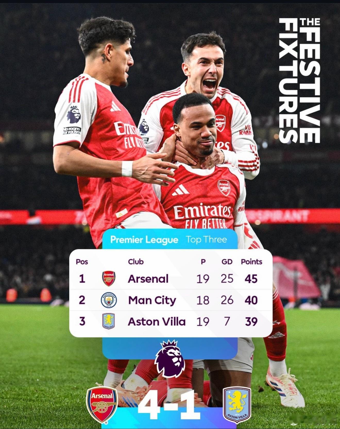 阿森纳vs阿斯顿维拉第19轮英超焦点大战,阿森纳最终以一场4比1大胜,终结了维拉的各项赛事11连胜,也确保了自己继续在英超积分榜上的领先。阿森纳打破僵局又是通过角球,这是阿森纳2025年在英超联赛里通过角球打进的第 17球。“我感觉到球队的精神属性正在飞速成长,而且每场比赛都在变得更强。”本场进球的热苏斯这样评价球队的表现。到目前本赛季英超射手榜前 17 名里,看不到阿森纳球员的名字。本队进球最多的特罗萨德 5 个进球,而曼城前锋哈兰德本赛季已经打进 19 球。但阿森纳总进球仍然是英超目前第二, 12 个丢球英超最少。