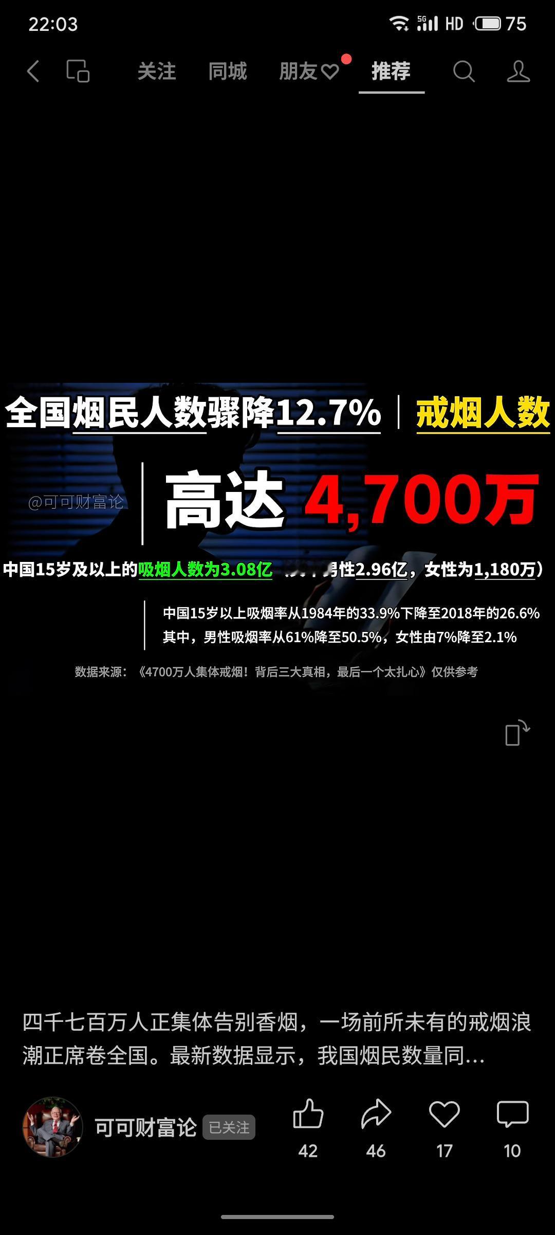 全国烟民人数显著下降,戒烟人数达4700万。最新数据显示,15岁及以上吸烟率为26.6%,较1984年明显降低。其中男性吸烟率下降至50.5%,女性降至2.1%,反映控烟成效。网友们表示,主要功劳还得是手上没闲钱。