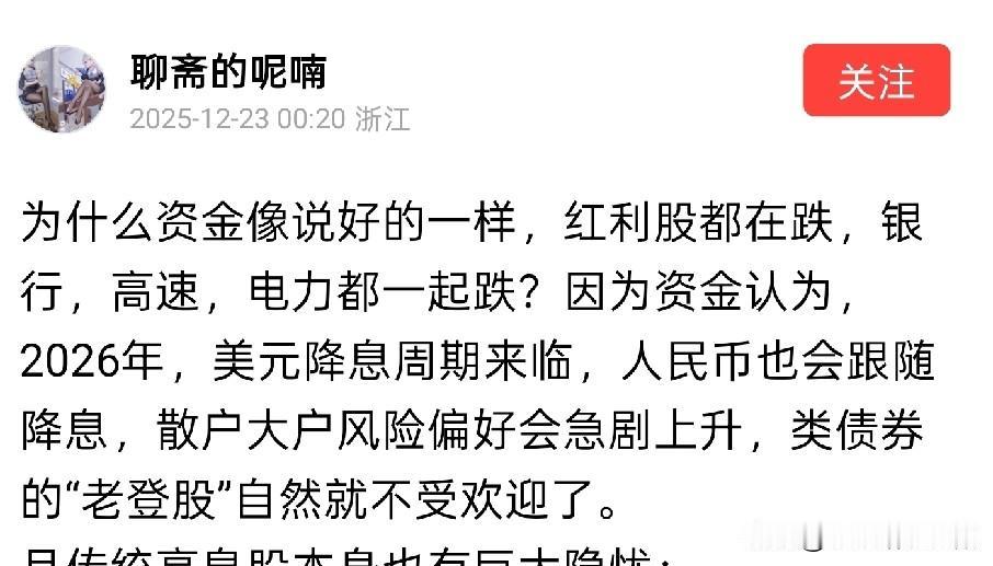 一张嘴两张皮,上下随便翻。 现在把红利股下跌归咎为降息的预期(但实际上近期美联储降息,我们已经不怎么跟了),22-24年也是进入了国内的降息周期,但此时红利股因为股息和存款债券收益差性价比不断上涨。为什么到了2025-2026,假设真的有降息预期,红利股反而没有性价比了呢? 资本市场是由多种驱动因素驱动的,任何一个资产的上涨或下跌,单日、单周可能受某个单个因素影响。但放眼到月度、季度和年度,一定不能有一个驱动因素,决定性的影响啊这个资产的价格。这种草草凭借自己想象,直接推出结论的内容,大家可以直接忽略