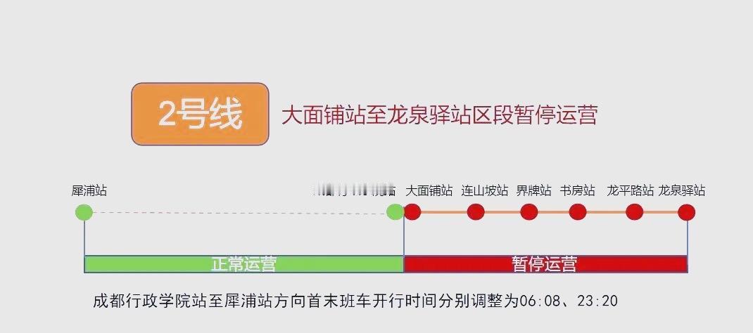 成都地铁2号线改建 成都地铁2号线东段因成渝中线高铁及铁路十陵南站建设需要,自2025年12月20日起,大面铺站、连山坡站、界牌站、书房站、龙平路站、龙泉驿站6个站点暂停运营,停运期从2025年12月20日至2026年10月底。改建完成后将在成都行政学院站与大面铺站之间新增“龙泉驿火车站”地铁站点,实现高铁与地铁无缝换乘,促进铁路与城市轨道交通便捷换乘。 为减少对市民出行的影响,成都将提前开通地铁13号线一期和30号线一期,并开行10条公交快线(含3条全日快线和7条高峰快线),在洪河站、龙安站、龙泉驿火车站南站周边新增停车场。成都地铁 成都地铁规划
