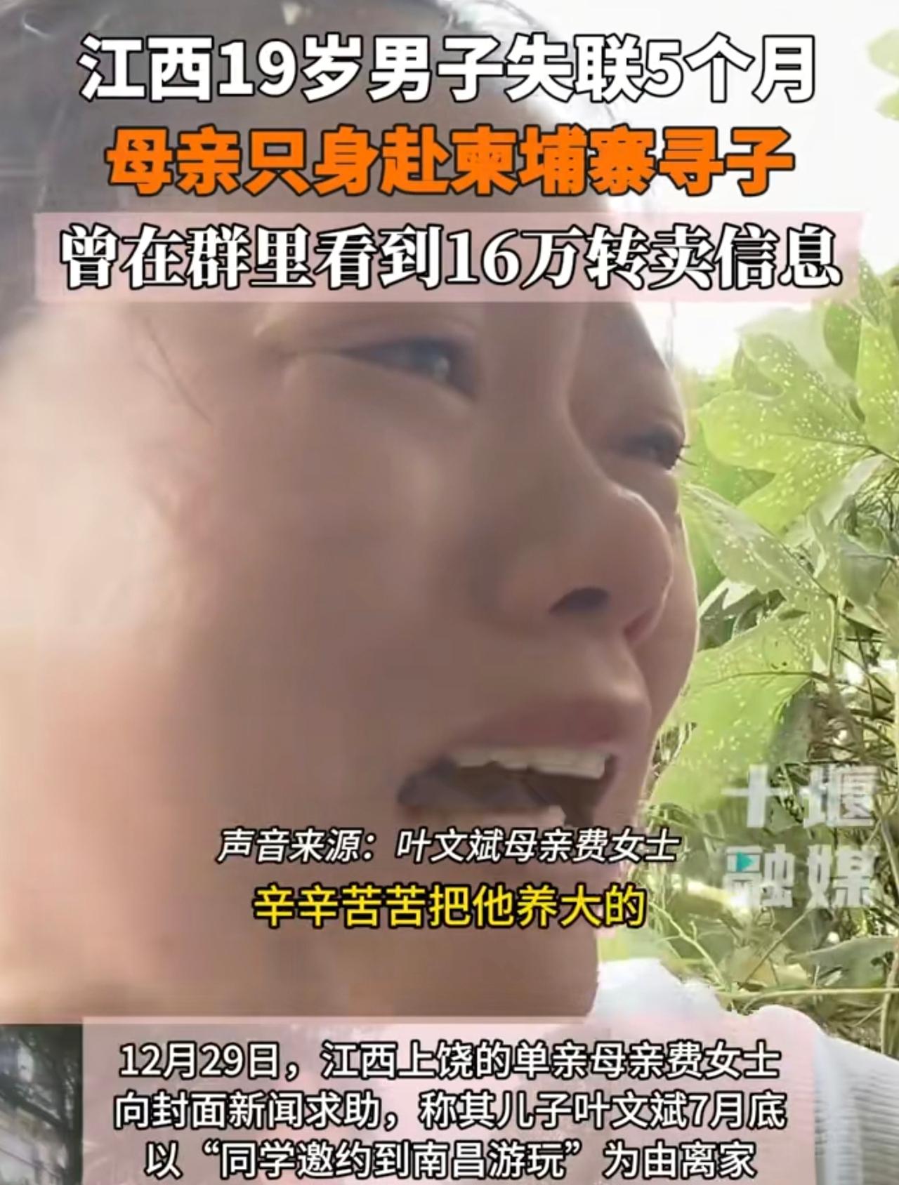 江西19岁男子以“同学邀请去云南玩”为理由离家,后经云南、广西等地,最终方向为柬埔寨,目前已经失联5个月,其母亲在群内看到一则信息“转卖一名中国籍猪仔,10万买16万卖”,看照片身形特别相似,而且身上有多处被打痕迹,虽然有警方介入,但是心急如焚的母亲只能只身前往柬埔寨,希望能联系上买家,只要用钱能换回来也是值得的。柬埔寨失踪案