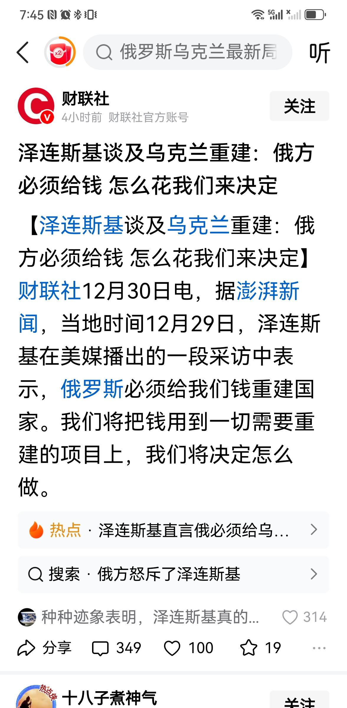 乌克兰总统:俄罗斯得赔钱!打赢了也得赔!你以为俄罗斯是晚清时候?! 乌克兰总统像个心智不全的孩子,仗都打成这样了,即便俄罗斯算不到大胜,至少他没输还占着不少优势。 不说留不留你泽圣全尸,你总该用眼看一看乌克兰真实的处境吧? 一切难道不是以实力说话反而是以一哭二闹三上吊作算吗? 如果这样就有好结果,那双方牺牲掉的几百万战士岂不是白死了?! 这些政客最可恶! 死的只要不是他们,他们都无所谓。 在台上拼命捞钱,下台后四处享福。 看看乌克兰那帮高官,在西方过的多滋润。受苦只是乌克兰的老百姓! 乌克兰如果继续任由这帮吃里扒外的政客胡来,只怕乌克兰真的不会有未来了。 俄罗斯与乌克兰冲突的最终走向会如何 泽连斯基和普京的博弈谁能胜出 泽连斯基希望美国保护乌克兰50年