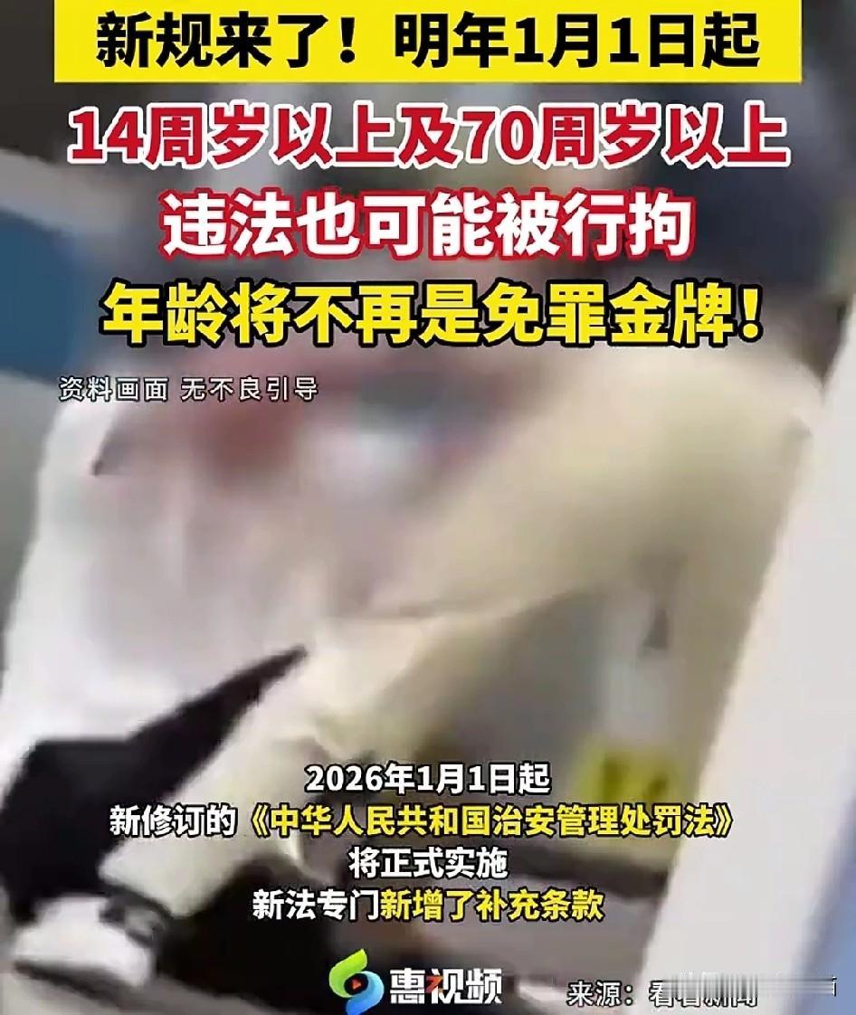 必须举双手支持下调刑事责任年龄。 以后校园霸凌等恶性事件,将会被有效的遏制。 从2026年1月1日起,14周岁以上未成年人,70周岁以上老年人都有可能被行政拘留,也就是说因年龄而豁免的情况将被打破。 看看这些年,有些未成年人霸凌他人,甚至强奸,杀人等恶性案件屡有发生,不是不知道对错,是在钻法律的空子,因为是未成年人所以有特殊的保护,问题是那些受害者也是未成年,他们才更应该受到法律的保护。 现在是什么年代了,这帮未成年人的心智都不输成年人了,如果管理再不与时俱进,就会让某些人更加肆无忌惮。