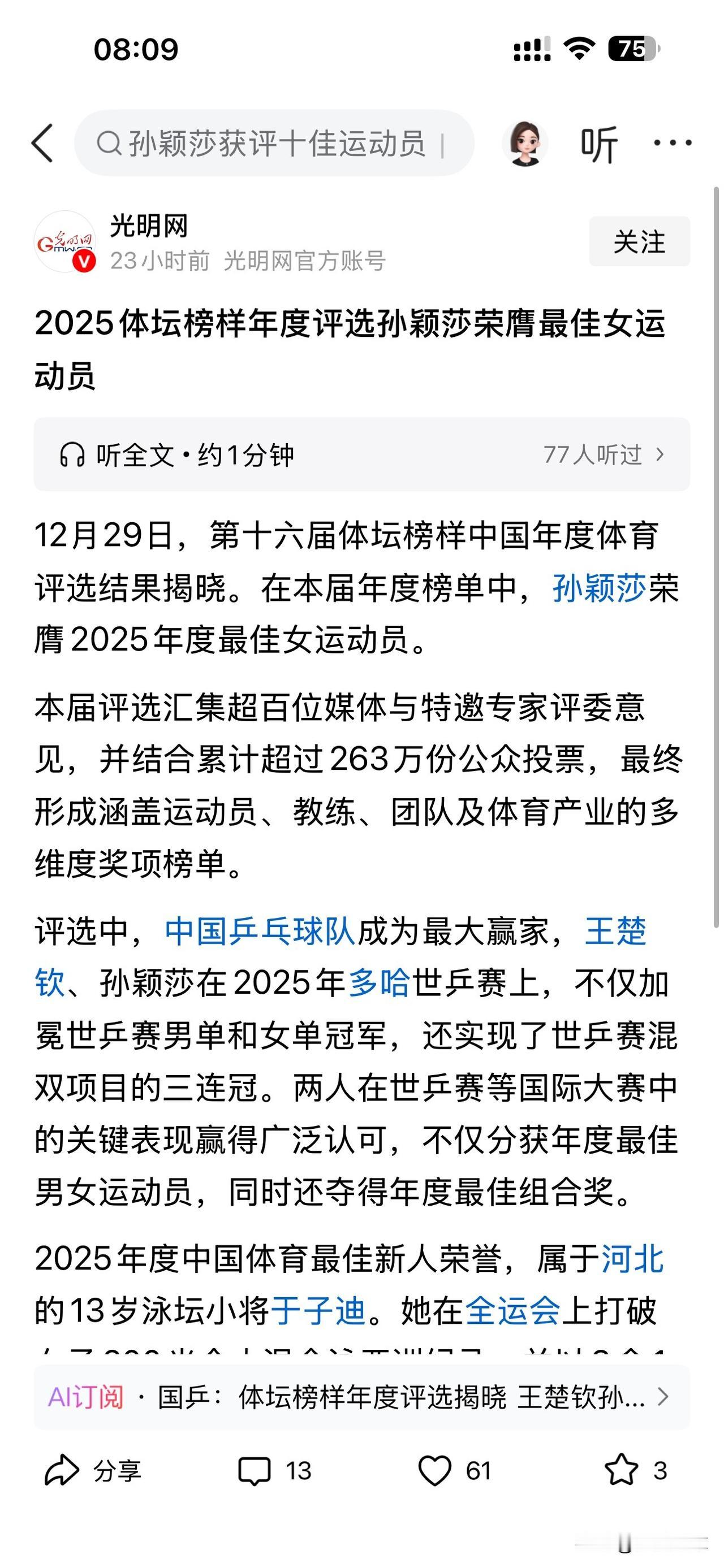 跨年之际:孙颖莎被 3 大官方“认可”👍 1、 新华社体育部,把孙颖莎评选为2025年十佳运动员之一。 2、 莎莎登上了«中国妇女»杂志封面,莎莎入选2025年度中,最有影响力的《中国妇女》时代人物! 3、12月29日,第十六届体坛榜样«中国年度体育人物»评选结果揭晓。在 2025 年度榜单中,孙颖莎荣膺2025年度:最佳女运动员。 祝贺莎莎,这是来自 3 大官方的认可! 一年的辛劳,这是最大肯定! 2026 莎莎披荆斩棘再展宏图!💪