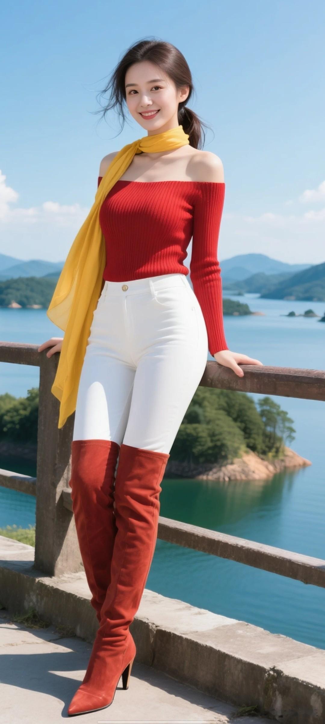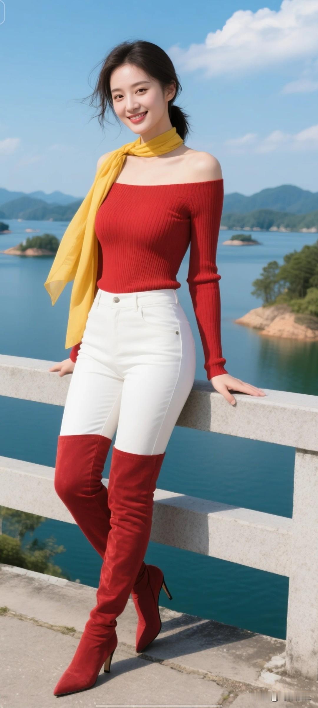 年轻明星美女,皮肤白皙通透微反光。前发些许凌乱,后发扎成低马尾。绝美眼睛,丰腴葫型身材,胸形饱满,唯美迷人,注视着镜头,身穿紧身针织红色露肩上衣,白色紧身裤,尖头细跟长筒过膝长靴肩披黄色丝巾,优雅气质,靠在小岛湖边栏杆上,栏杆后边千岛湖风光,山水如画,极致美景,蓝天白云,晴空万里。大师杰作,大师级黄金比例构图,正面照,全身照,超高清广角镜头拍摄,高级感,超高细节画面,高清晰高饱和度。近距离特写,唯美迷人,注视着镜头浅笑