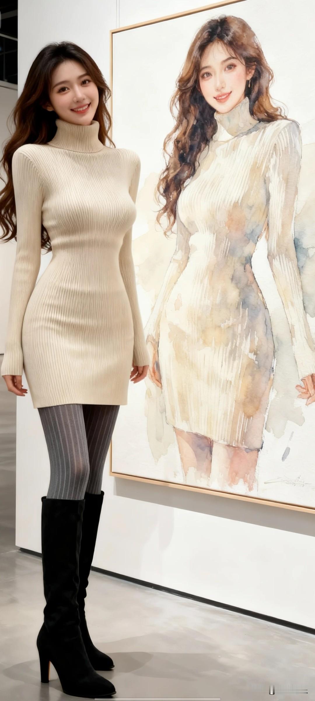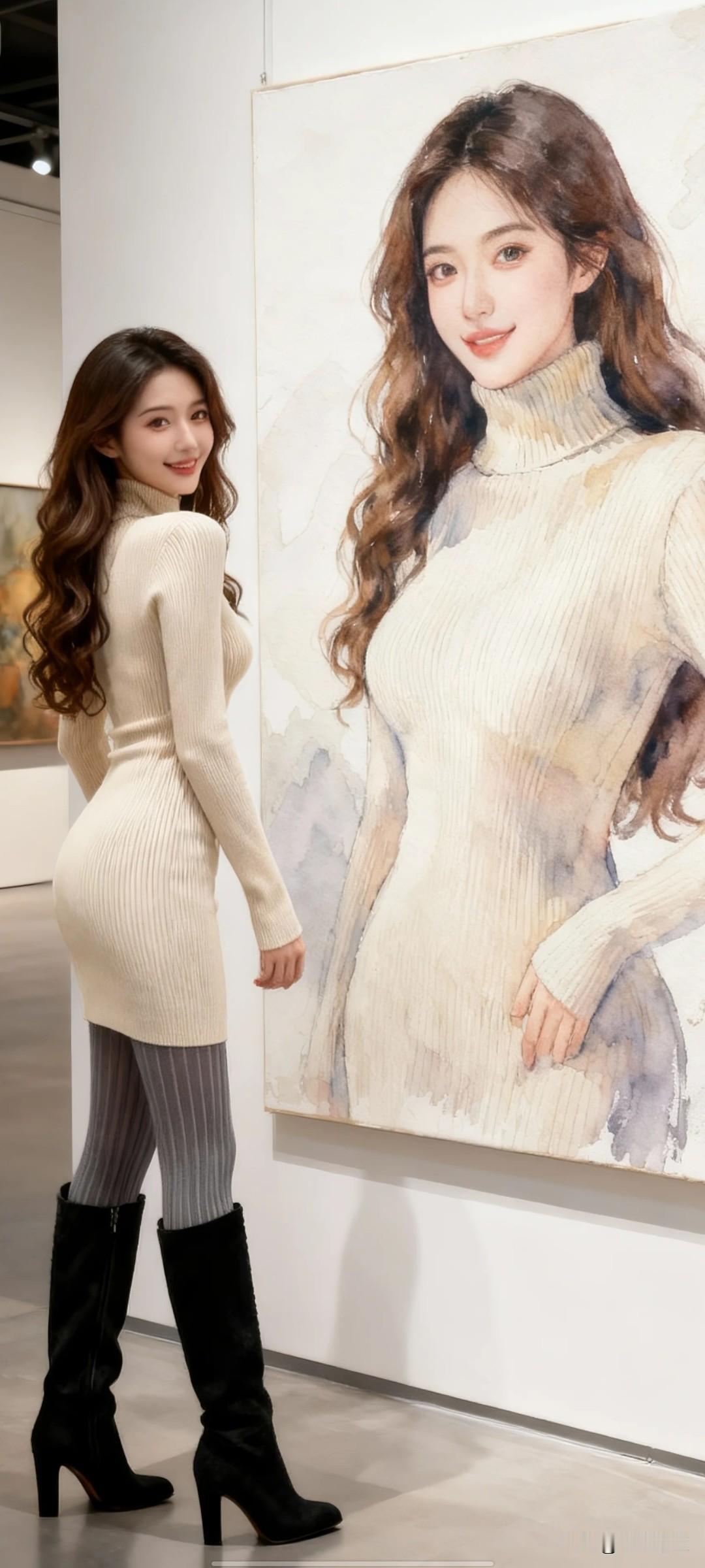画面中女士穿着长款毛绒衣服,竖纹灰色打底裤,黑色毛呢高跟高筒靴,模特甜美风亚洲美女,模特年龄25岁,身材高挑,鹅蛋脸,波浪卷发,神情愉悦,手里不要拿衣服, 高清镜头,艺术展厅,一位美女站着自己同款穿搭的自画像前,超清32K,大美女,极致立体的五官,冷白皮,美颜美白效果。大师级人像摄影,模特穿着一致,画质清晰,超高清,高级感,绝美眼睛,,细腻渲染,绝美眼睛,含情眼,丰富的细节,高质量,真实逼真,自画像是水彩画,细腻肌理。