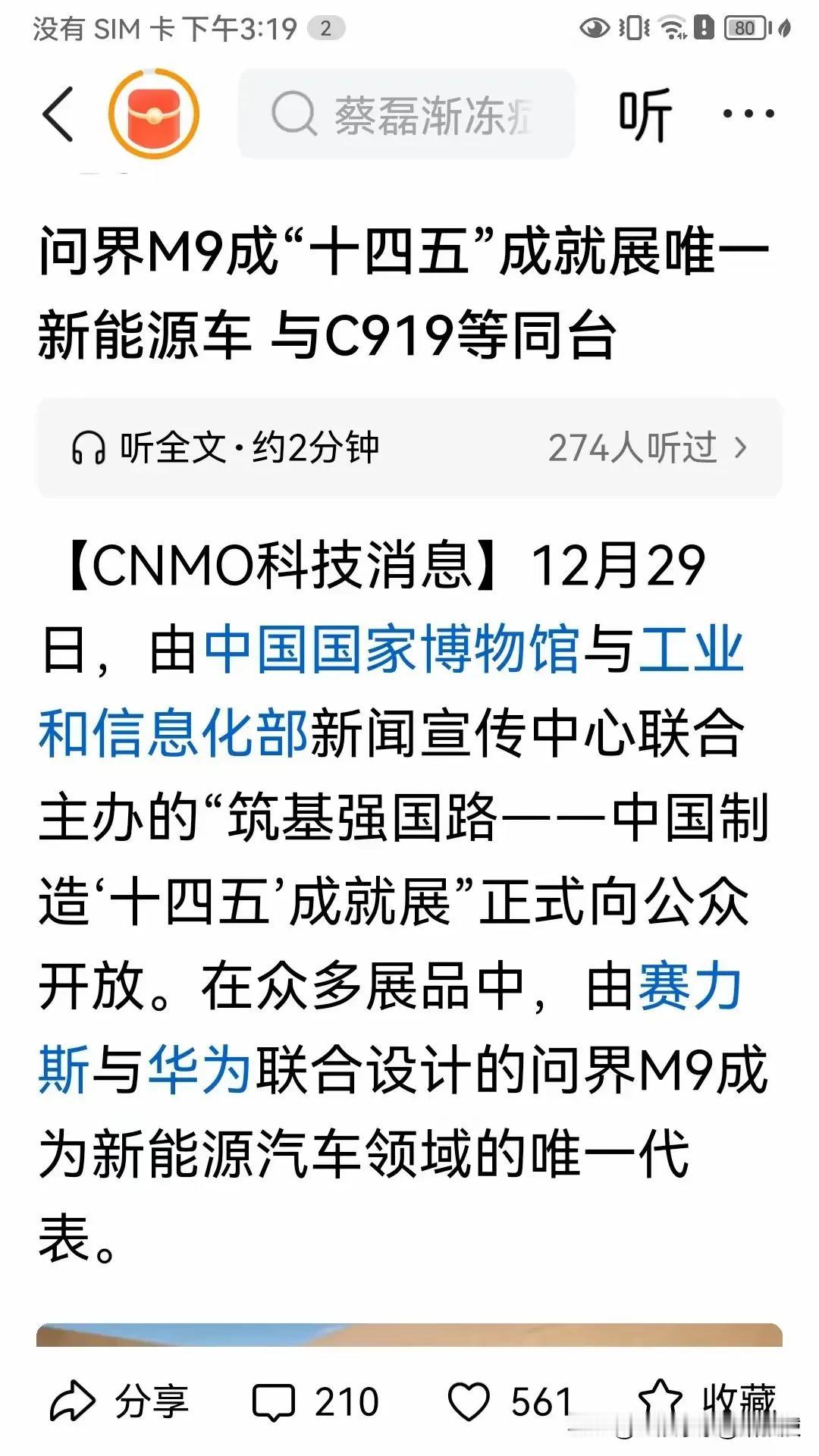 问界M9或许真的能保值,已经摆进国家博物馆了。刚刚看到M9入选了中国制造“十四五”成就展中唯一的新能源汽车代表,在中国国家博物馆展出。问界M9是华为和赛力斯合作的一款车型。 赛力斯是华为第1家深度智选合作车企,问界M9上市两周年,累计交付量突破26万台,连续20个月稳居50万级豪华车销量冠军。 很多人问,为什么会选问界M9,而不是比亚迪等其他品牌的同价位的车呢?核心原因就是问界M9把车企的造车实力和华为的智能技术深度绑在了一起,精准诠释了中国新能源汽车从“规模领先”到“高端引领”的跨越。