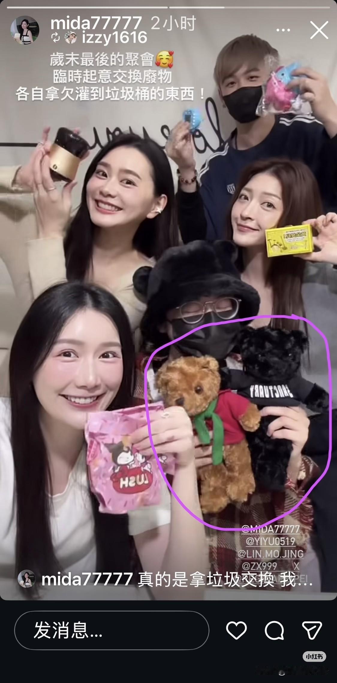 继被骂“劈腿仔”后 绯闻前女友再次对林俊杰贴脸开大 把林俊杰周边当废物扔垃圾桶 这位前嫂子在社交平台分享日常,她和朋友聚会,几人交换废物。 其中有两个小熊玩偶是林俊杰的周边圣所熊。 看来这位前任是真的很恨呀,连林俊杰相关的东西都不想看到。