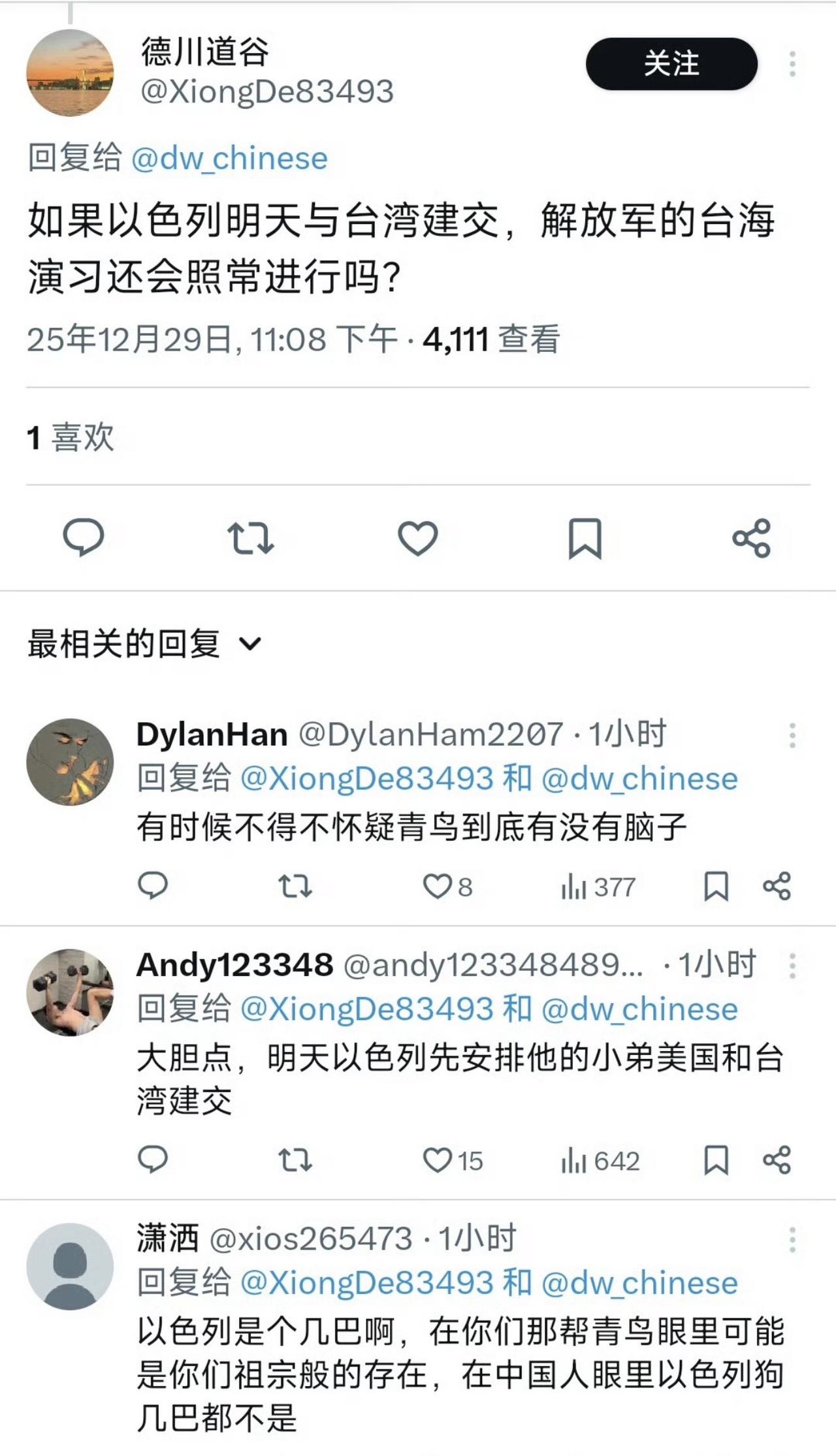 不是,之前台伪军不是说解放军进到12海里内,就开火吗?现在解放军都进到5海里之内呢?而且无人机给你们一顿拍,怎么没动静呢?那么怂吗? 不仅怂还可笑,一边嘴硬,一边p图自嗨!就这点本事儿? 我们就明目张胆开进去了,怎么了,日本没有声,美国“不担心”! 于是部分台蛙又开始发梦希望可以和以色列“建交”,以寻求保护!这脑回路我真的服了! 首先以色列不敢和你们“建交”,你们不是国家,其次他们也根本不会在乎你们,更不会保护你们,跟美国,日本一样当看不见![灵光一闪][灵光一闪][灵光一闪][灵光一闪][捂脸][捂脸][捂脸][捂脸]解放军军演对台湾问题有何积极影响 解放军围台军演释放什么信号