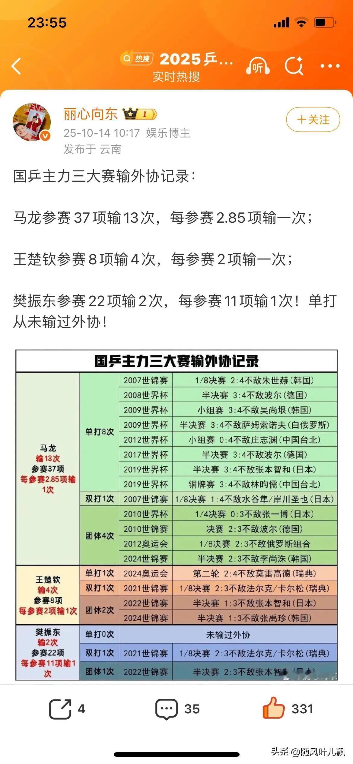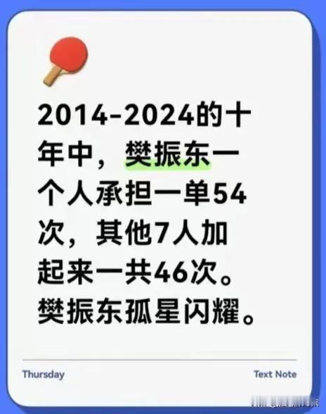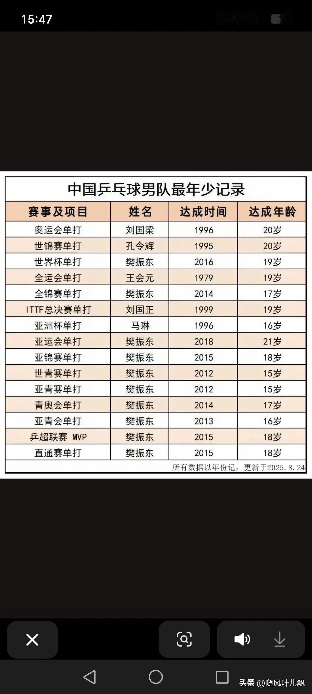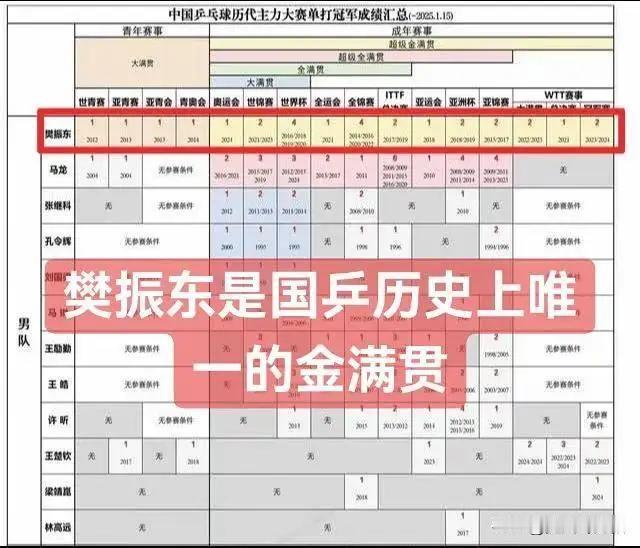 樊振东为什么这么牛?看23456图。 图2:职业生涯超级金满贯。连双圈大满贯马龙没有的青年赛事大满贯、地表最强三连冠、军运会四冠王和WTT赛事大满贯、总决赛和冠军赛冠军,而樊振东全都有。 图3:中国乒乓球男队最年少冠军纪录,樊振东有10个。 图4:三大赛输外战纪录:樊振东输得最少,只有2次,一次是双打一次是团体,单打全胜。 图5:2014-2024,樊振东承担团体一单54次,其余人的总和才46次。 图6:樊振东是乒坛历史上唯一的超级金满贯,绝对前无古人后无来者。