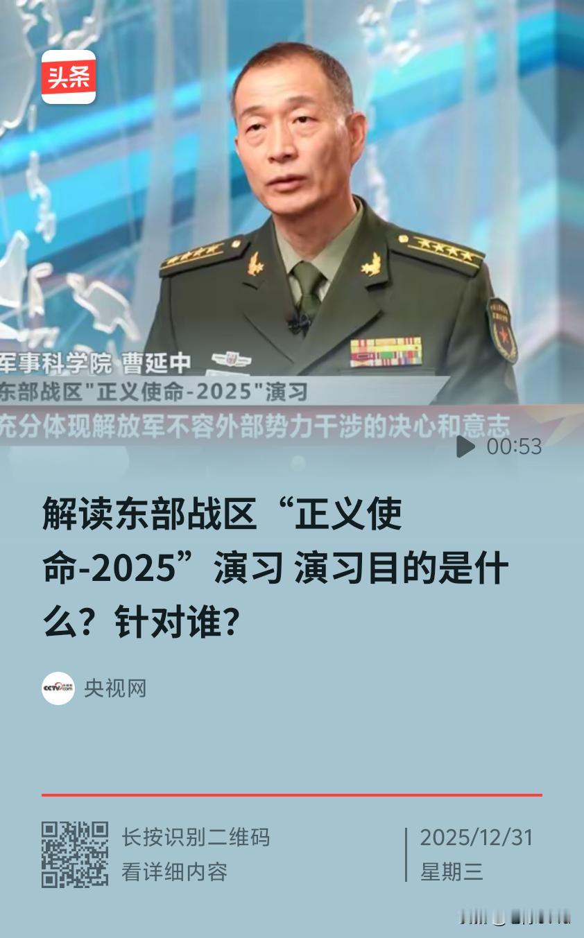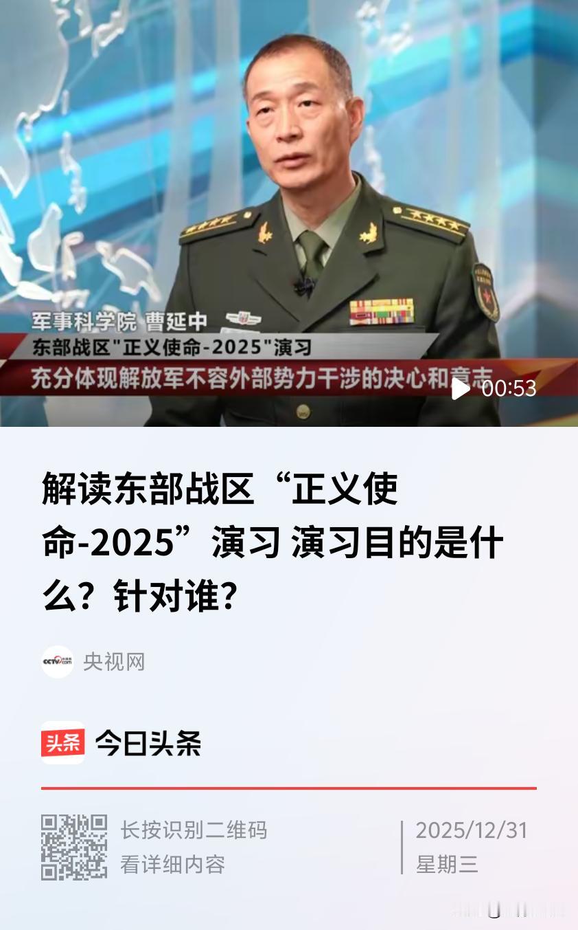 12月29日起,中国人民解放军东部战区组织“正义使命 - 2025”演习,在台岛周边开展行动,这是对“台独”分裂势力和外部干涉势力的严重警告,是捍卫国家主权、维护国家统一的正当必要行动。 演习背景 近期美台勾连动作频频且性质恶劣,主要体现为金额、性质和体系三方面升级。美方批准对台总额逾111亿美元军售计划,此次售台武器多为进攻性,还包括使台军作战体系成为美军延伸的套件,推高了中美冲突风险。 演习区域 演习区域包括台湾海峡、台岛北部、台岛西南、台岛东南、台岛以东。相比以往,此次区域更靠近台湾本岛,五个区域形成三面围岛之势,针对性和指向性明显,如封锁北部重要港口、切断南部最大海上航线、针对外部势力援助通道。 参演兵力及科目 ● 海军:宝鸡舰、衢州舰、太原舰等编队开展主副炮实弹射击、防空反导、对海实弹射击、联合反潜等演练;海南舰编队协同轰炸机编队等开展舰机协同、对海打击等科目演练。 ● 空军:多型战机组成大规模空中编队,开展对海突击、区域制空、对陆打击等科目演练。 ● 陆军:多个远箱火打击分队进行模拟打击。 ● 火箭军:多支部队对陆上固定重要军事目标进行多波次、大弹量模拟打击,同步对敌高机动高价值目标火力追瞄。 远箱火装备优势 ● 模块化设计:可快速吊装不同弹药箱子,灵活变换打击目标和距离,实现大面积火力覆盖和点穴式精确摧毁。 ● 快和活:具备快速移动、发射、装填和打击能力,打完可迅速转移。 ● 成本较低:有导弹精度,价格却没导弹昂贵,可大批量生产。 ● 射程远:能从数十公里打到数百公里。 演习效果及意义 ● 效果:一是立体封控,内封更严、外拒更远,出动多军兵种和海警力量,把台岛封得更死,遏制外部干涉;二是演习区域离台岛更近,挤压“台独”生存空间;三是点穴式精打,打击台军舰机目标、“台独”首恶分子和重要军事基地。 ● 意义:此次演习旨在维护国家主权和领土完整,维护全体中国人民根本利益,反对“台独”分裂行径和外部干涉。其安排符合国际法和国内相关法律,具有正当性、合法性。彰显解放军捍卫主权、遏制“台独”、反对外来干涉的决心与能力,表明统一是历史大势,“台独”与外部干涉注定失败。