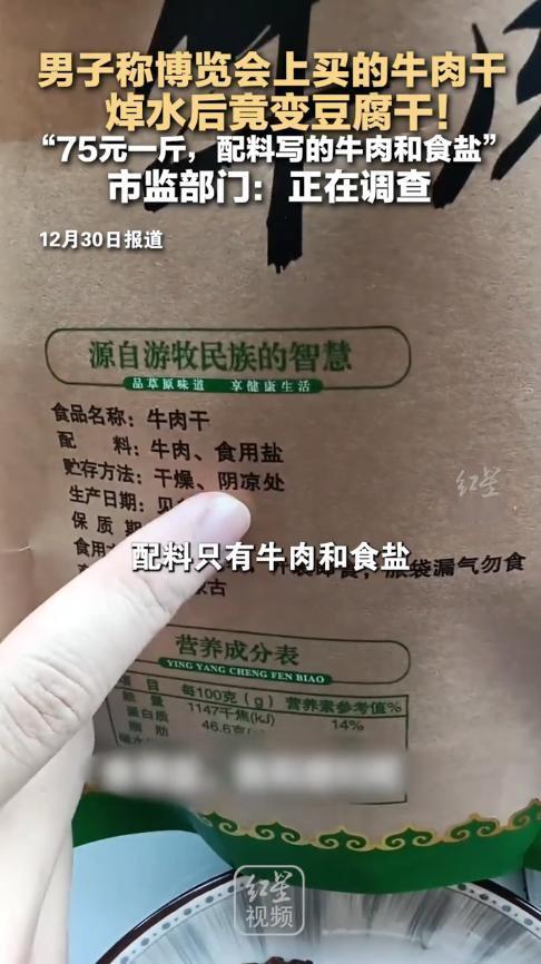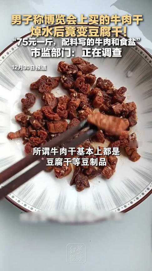 “严查到底!”12月28日,湖南长沙,一男子逛展会时,购买了一些牛肉干,由于自己平时吃得很清淡,回家后他就先焯了下水,结果“牛肉干”却变成了“豆腐干”!男子还特地看了下配料,确实没有豆腐。网友:配料不是配料表! 现在很多商家为了推广自己的产品,不仅会花钱参加展会,还大方的让游客们来试吃食物,然后借此机会宣传一下产品,很多游客也觉得敢让自己品尝的,应该都不会有问题,于是便买了一些。 当时长沙地区就有一个食品展会,男子刚好在家没事,便带着女朋友去给逛了逛,在展会上,一位卖牛肉干的摊主邀请他们过来试吃,二人品尝后,感觉除了咸一些外其他的都挺好,就购买了一些。 回到家后,男子拆了几包牛肉干倒进锅里,打算焯完水后再吃,可等到煮得差不多后,锅内的牛肉干却变成了两种不同的东西。 颜色较深、颗粒较小的应该是牛肉,另一种则很明显是豆腐干!这不是上当受骗了吗? 男子感觉有些不可置信,就这么明目张胆的骗人吗,他看了眼配料,确实没有找到豆腐,这下可以确定要么买到了假货,要么就是商家故意的。 男子立即打电话举报,并将视频发到网上,很快就引起了网友的关注,斥责这群无良商家!做生意讲究的就是诚意,有豆制品可以,但是需要明确标注,更不能和牛肉卖一个价格。 信息来源:《男子在展会上买“手撕牛肉” “牛肉干”焯水后成“豆腐干” 配料表写着:牛肉 食用盐》大风新闻