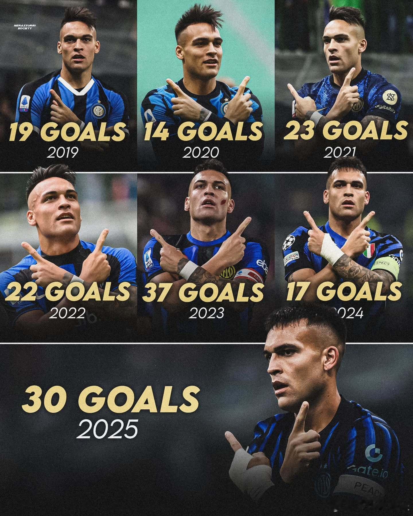 劳塔罗近7个自然年俱乐部进球数国际米兰意甲劳塔罗