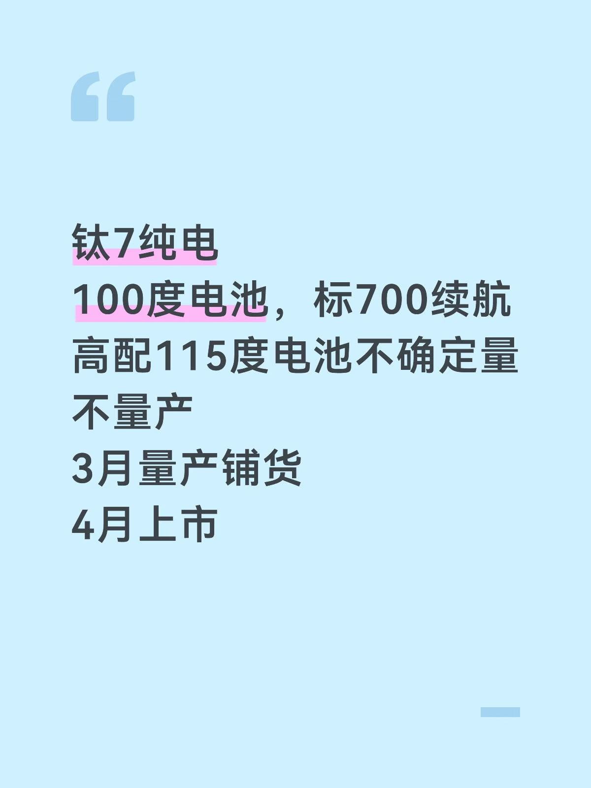 比亚迪的方程豹钛7纯电版要来了,会不会成为新爆款,钛7的月销量会突破3万吗? 100度电池,标700续航 高配115度电池不确定量产不 但是800v平台应该要给了 纯电钛7,3月量产铺货,4月上市。 方程豹钛7 作为月销2万+的硬核方盒子SUV爆款,价格又很有优势,也很符合中国喜欢又大又硬核的特点,一直等车时间很长。2026年纯电版上市会不会更卷。
