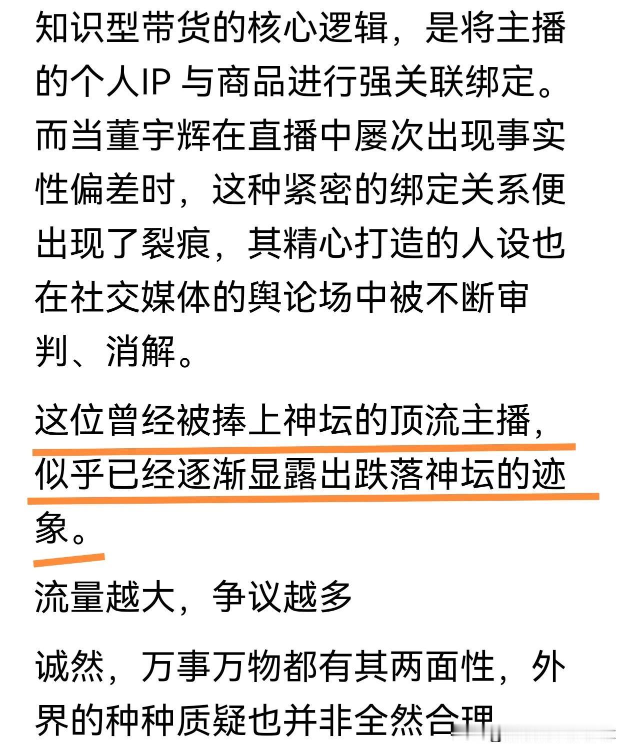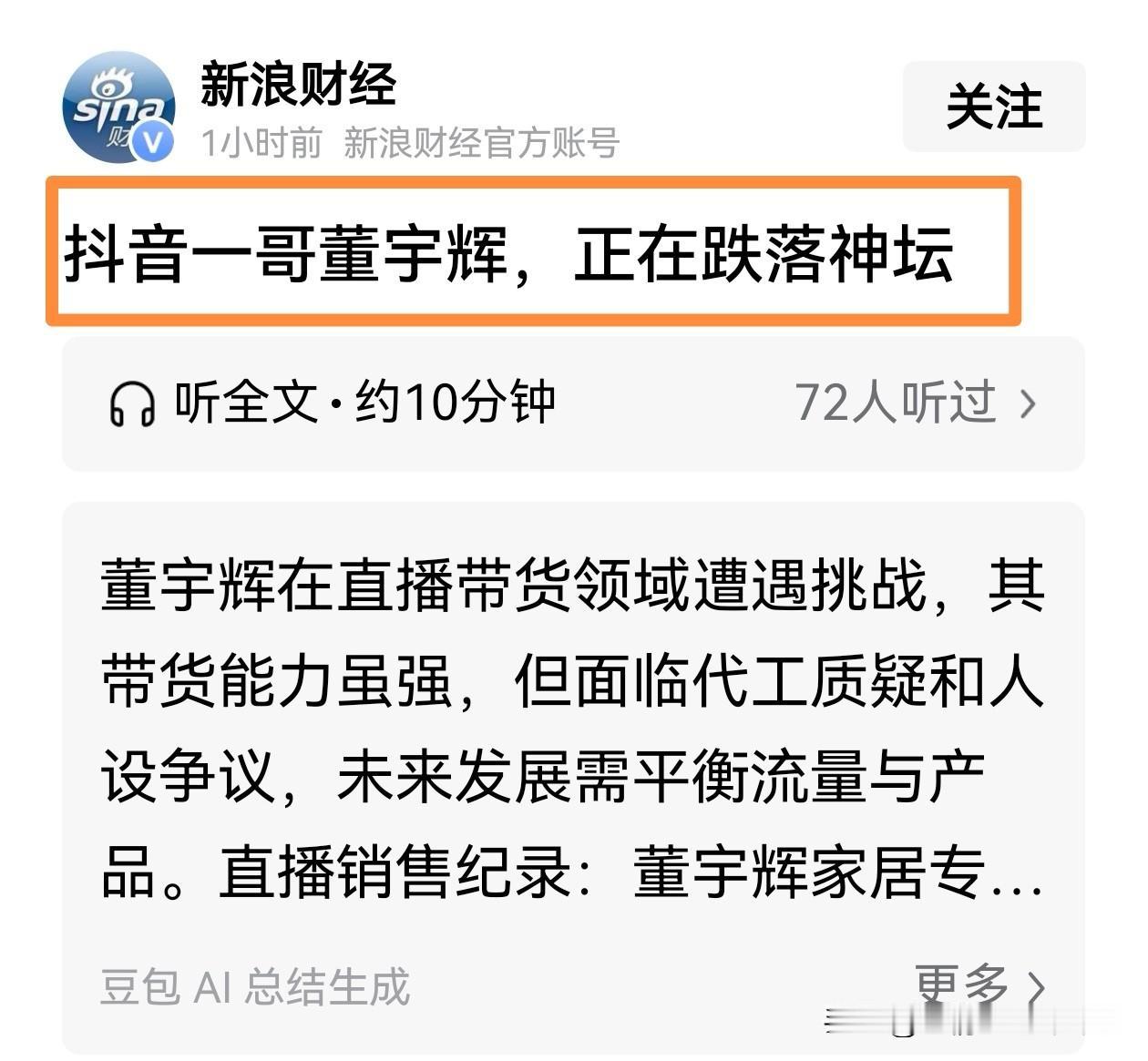 刚刷到新浪财经的一篇文章,标题是《抖音一哥董宇辉,正在跌落神坛》,看完整篇文章,我只想问问这位小编: “董宇辉不在神坛,如何拉下?” 这篇文章列举了董宇辉和“与辉同行”最近有争议的事件,比如沙发代工质疑,英语口语语法错误,虾仁事件,售后问题。 这篇文章无非是想借这些争议事件,表达两个观点: 第一,宇辉离开东方甄选之后,失去了他的文化光环,开始跌落神坛。 第二,“与辉同行”没有自营产品,供应链存在明显短板。 看完那篇文章我就一个感觉:小编是不是先给董宇辉盖了个“神坛”,再自己把他拽下来啊? 了解董宇辉的粉丝都知道,他从来就不是什么被捧在云端的“神”,他就是一个从老师到卖货、从陕西农村走到镜头前,脚踏实地一步一步走过来的普通人。 他的“光环”他的“流量”不是凭空来的,是无数场直播、真诚推荐、认真纠错换来的。 “与辉同行”确实没有自营产品,要说供应链短板,那可太“致命”了——定制品老是秒光,几十万人抢不到。他们就该反省下,干嘛非把选品和检验搞那么严?多上点货,让大家随便买,不就没人抱怨了嘛。 我知道,有的人会说:“你就是被信息茧房困住了,只看得到粉丝的支持,看不到外面的争议。” 对,我承认我有我的“信息茧房”。是因为在这里面,我看到的是一个有诚意、有责任心、不断在努力的人。我选择相信他,不是因为我只听赞美,而是因为在他一次次面对问题、解决问题的过程中,我看到了真诚。 如果这样的“信息茧房”是正向的,我宁愿待在里面。就像许多211同学一样,我们不是因为盲目而聚集,是因为认同一种真实的、不完美的、却始终向前的力量。 我会继续相信他,管他是“神”还是“人”,今天晚上的跨年悦享会,不见不散! 董宇辉 与辉同行