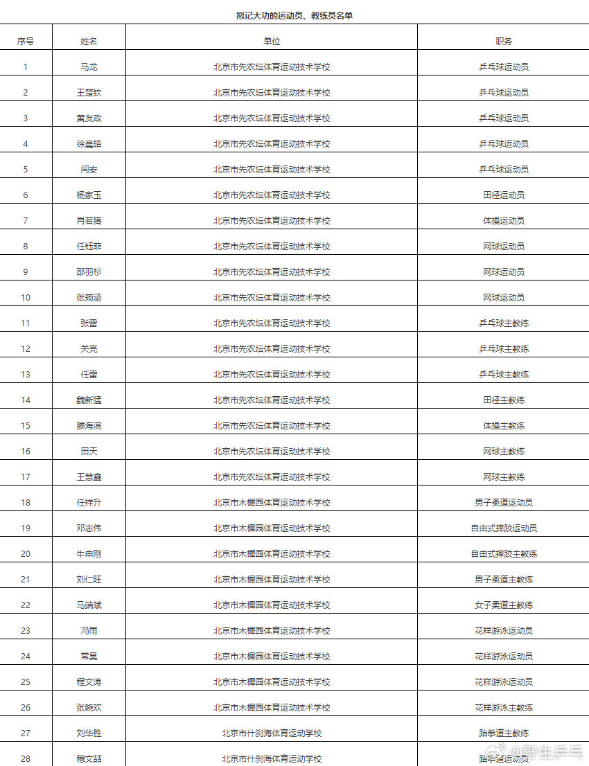 马龙王楚钦拟记大功 北京市体育局人事处发布《关于北京市参加第十五届全运会及时奖励拟记大功对象的公示》在第十五届全国运动会,北京体育健儿顽强拼搏、团结协作,圆满完成参赛任务,为首都体育事业再创佳绩。依据《北京市事业单位工作人员奖励实施办法》等文件规定,市人力资源社会保障局会同市体育局对在第十五届全国运动会上作出杰出贡献的北京运动员和教练员,开展记大功奖励工作。根据奖励工作部署,在有关单位积极推荐的基础上,经综合评审、统筹考虑,确定北京乒乓球运动队等9个集体,马龙、王楚钦等28位同志拟记大功对象拟记大功的运动队集体名单:北京乒乓球运动队、北京网球运动队、北京田径运动队、北京体操运动队、北京自由跤运动队、北京男子柔道运动队、北京女子柔道运动队、北京花样游泳运动队、北京跆拳道运动队拟记大功的运动员、教练员名单:马龙、王楚钦、黄友政、徐晨皓、闫安、杨家玉、肖若腾、任钰菲、邵羽杉、张筠涵、张雷、关亮、任雷、魏新猛、滕海滨、田天、王慧鑫、任祥升、邓志伟、牛申刚、刘仁旺、马端斌、冯雨、常昊、程文涛、张晓欢、刘华胜、穆文喆北京乒乓球队拟记大功