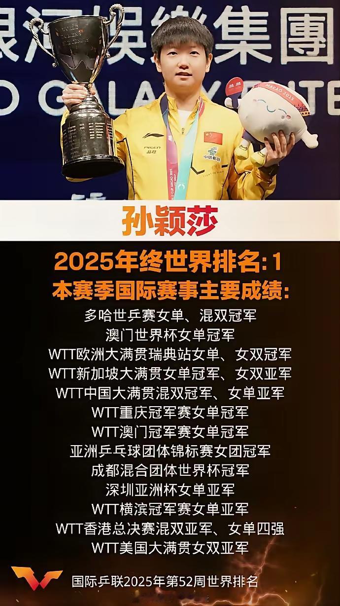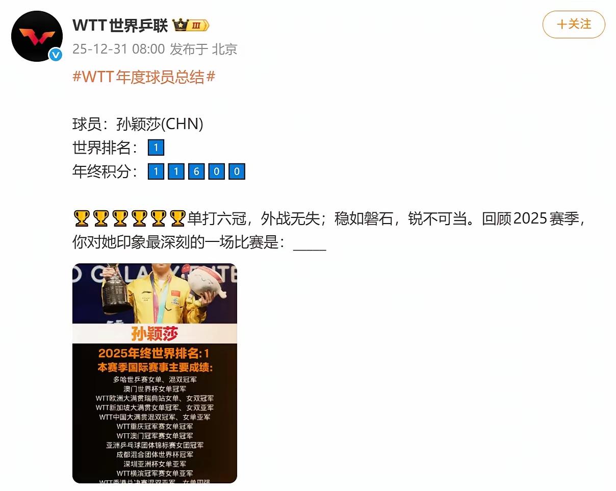 2025年最后一天,WTT世界乒联又表扬莎莎了! 今天是2025年12月31日,是2025年的最后一天,世界乒联给莎莎做了一个完美的年度总结:单打六冠,外战无失,稳如磐石,锐不可当。然后详细罗列了莎莎的辉煌战绩,给莎莎的2025画上了一个十分圆满的句号。 事实胜于雄辩,莎莎值得拥有世乒联和所有正义媒体的赞美,那些黑莎莎的丑陋灵魂在寒冬的阴暗角落瑟瑟发抖去吧!