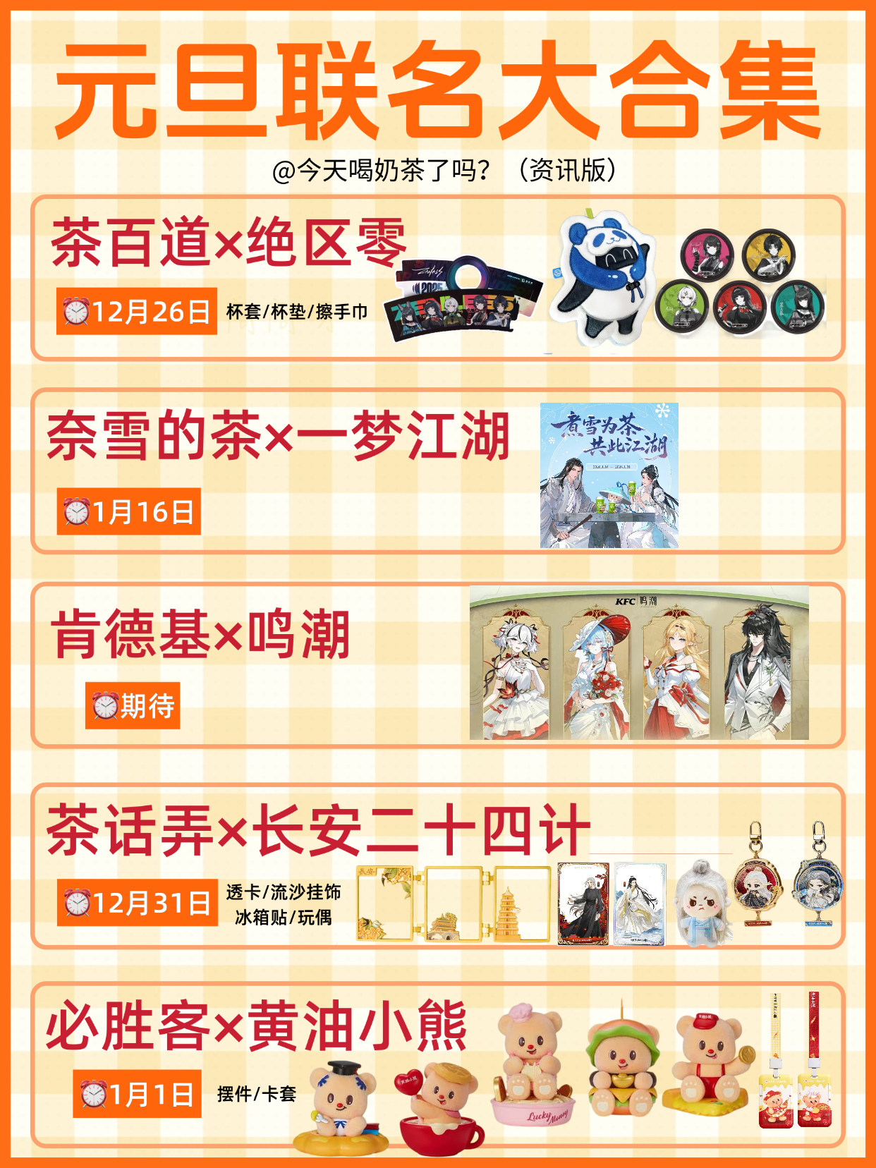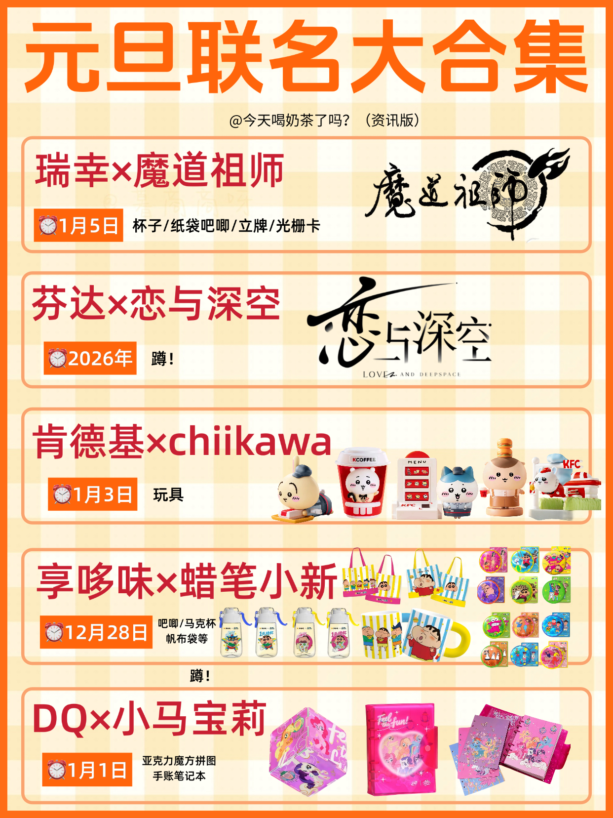 元旦的一些联名分享~感兴趣哪个瑞幸X魔道祖师芬达x恋与深空肯德基x cjiikawa享多味x蜡笔小新DQ X 小马宝莉茶百道X绝区零奈雪的茶X 一梦江湖肯德基X鸣潮茶话弄X长安二十四计必胜客X黄油小熊
