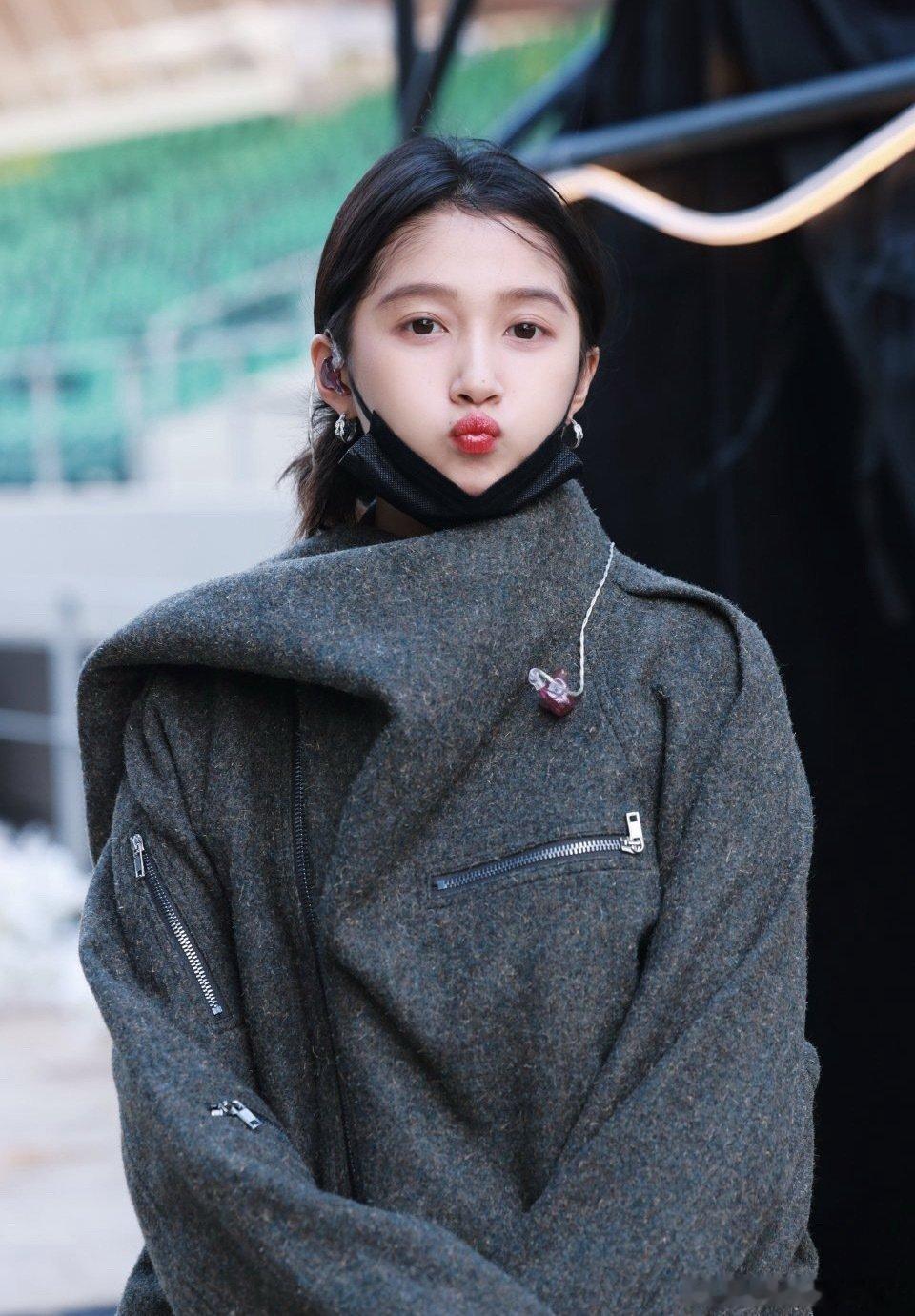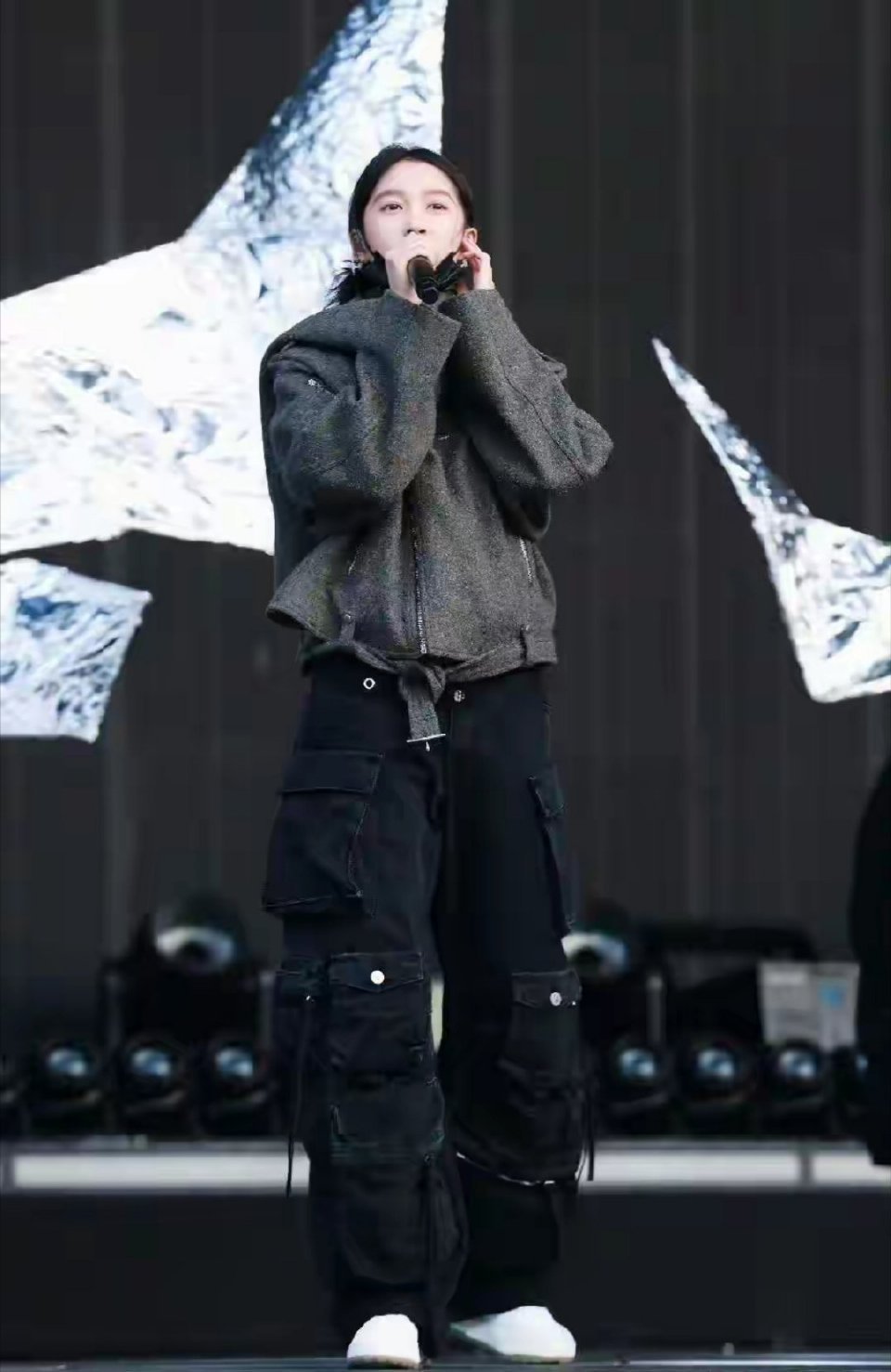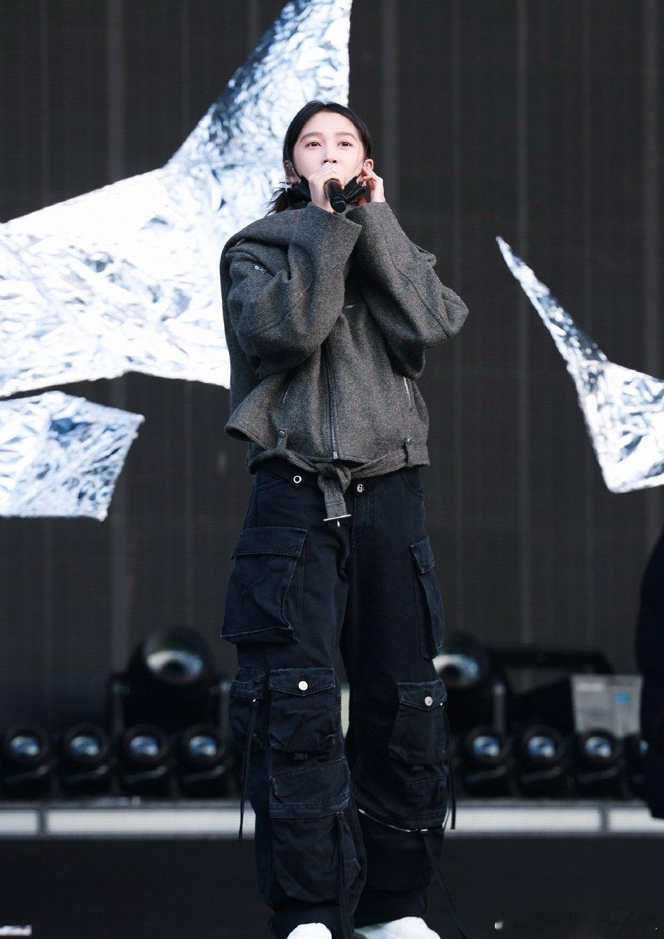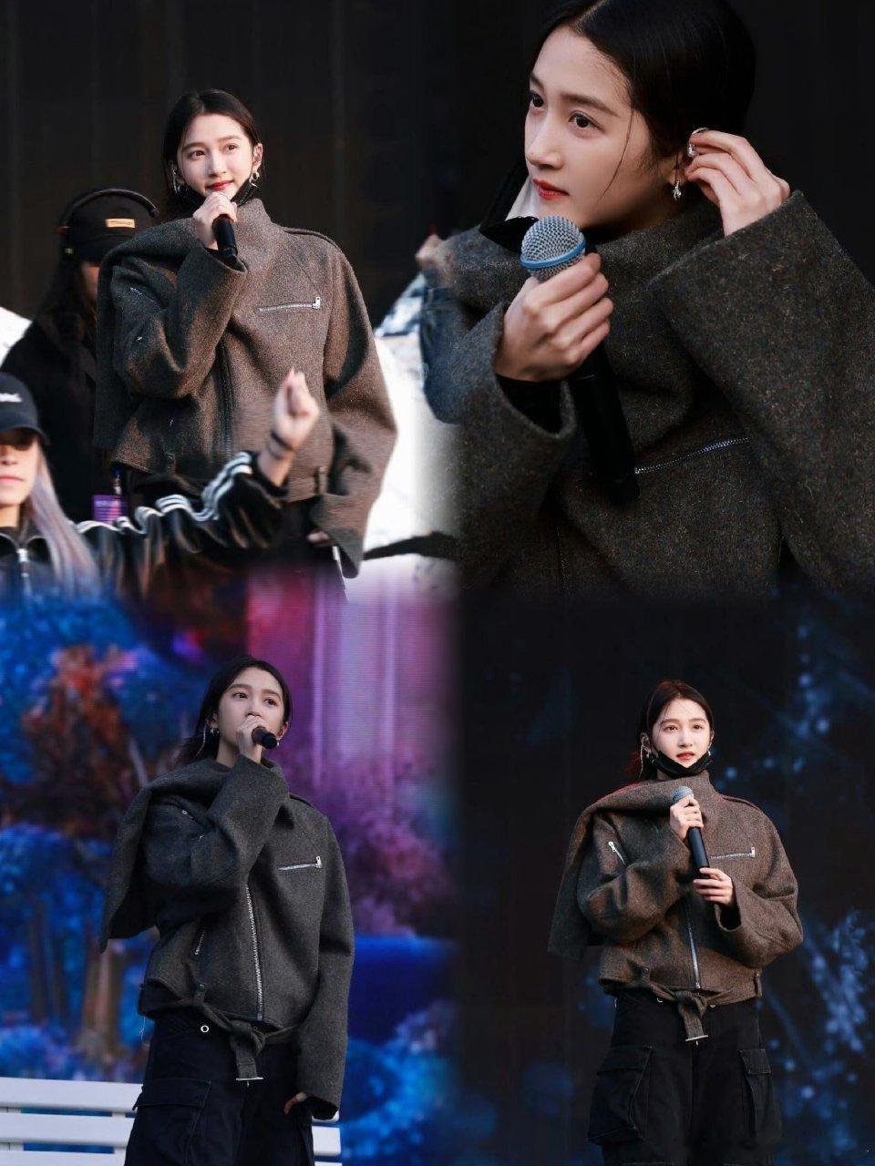 关晓彤浙江卫视跨年晚会舞台彩排图,灰色夹克配黑色工装裤 看起来非常潮酷