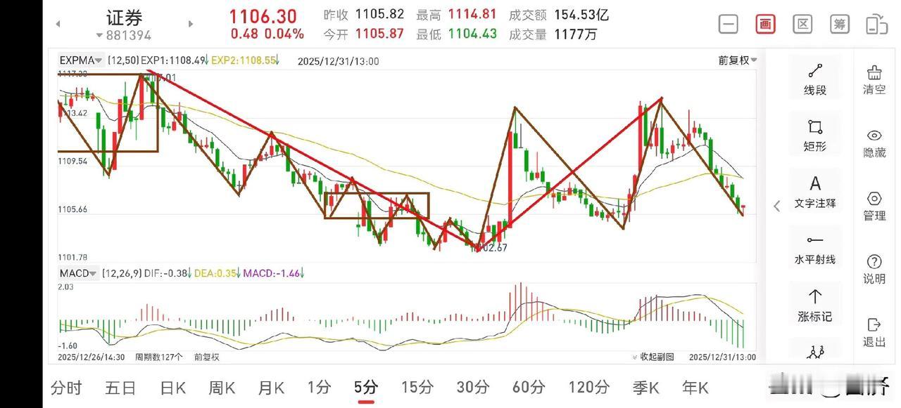 聊聊证券板块(2025.12.31) 今天是今年最后一个交易日,走势应该不会太难看,但元旦过后,恐怕不会再手下留情了,一波急速下挫即将来临,所以,当下就是管住手,不要因为涨了几天,而把风险抛之脑后,此处明确观点,短期继续看空,耐心等待大波段调整完成。 1.从30分钟图一上看,由于昨天形成的30分钟二卖并不完善,今天上午或者下午还会继续完善,待二卖结构完成后,一波下挫行情将不可避免。 2.从5分钟图二上看,目前正在回踩5分钟一笔,下午还会反复,此处不管它如何运行,都不用去理会,因为这是风险太大了,切勿操之过急。 最后㊗️大家元旦快乐!展望2026年,大家一起发财[招财进宝][招财进宝][招财进宝]证券板块动态 股票交易