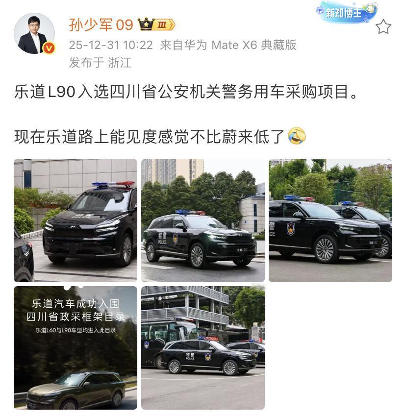 孙少军:乐道L90入选四川省公安机关警务用车采购项目。 现在乐道路上能见度感觉不比蔚来低了[允悲] 现在新能源车当公务用车的比例确实在大幅度增加,而且这种车的好处是不用报销油费,只要在单位里面装一个充电桩就行了。 相比较来说,电动汽车更加的节能减排,以及降低每公里的用车使用成本。各位是怎么看的?欢迎评论区留言。