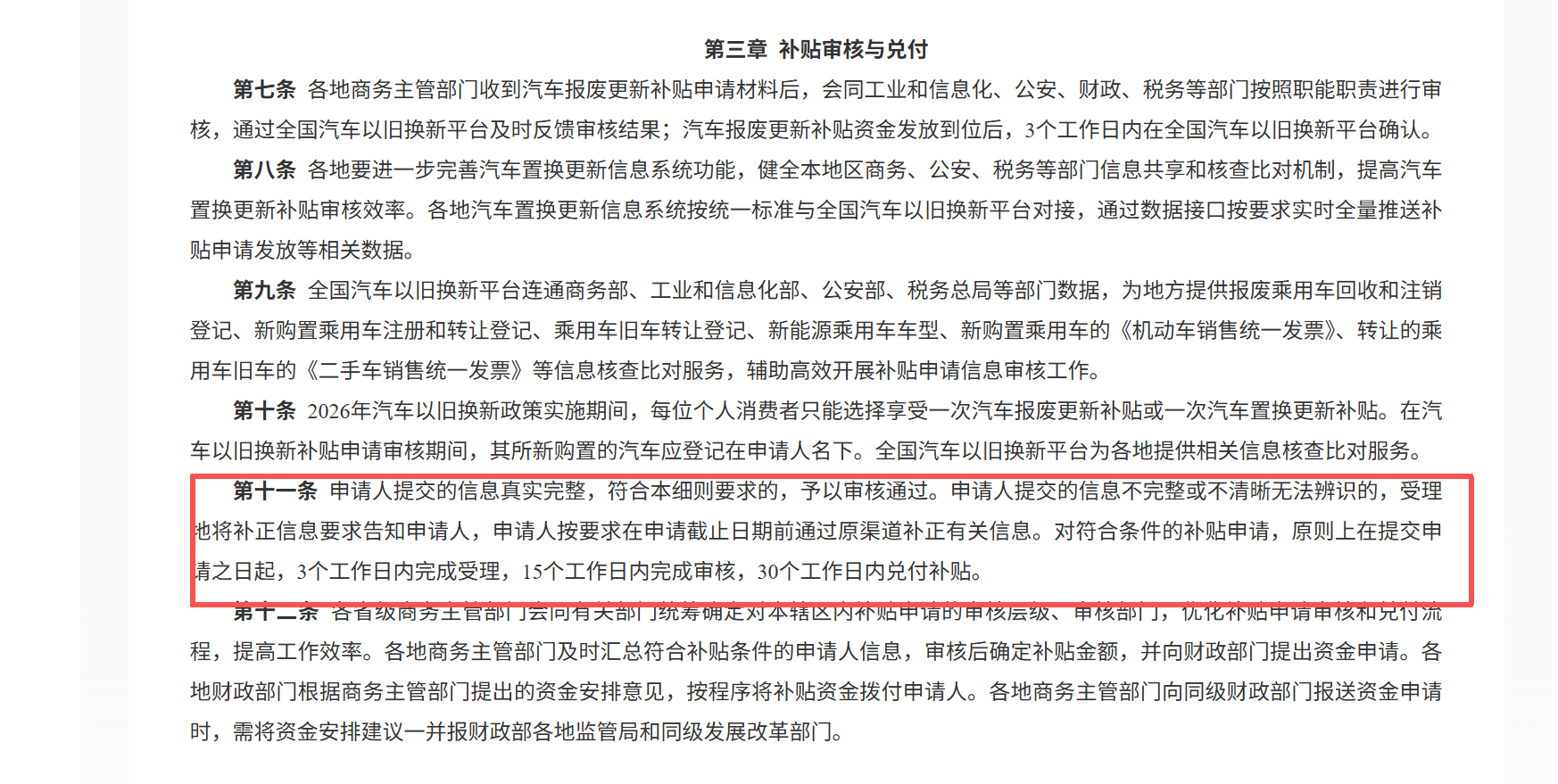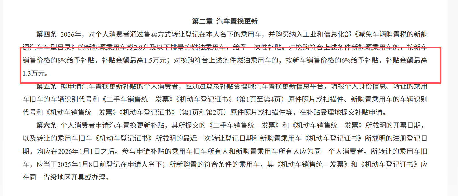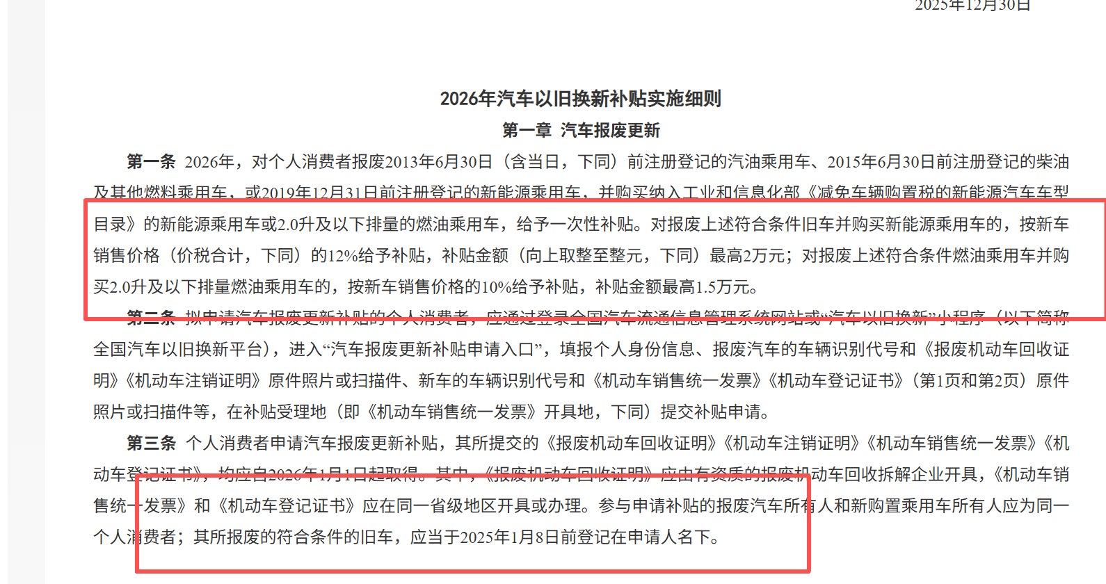 扩大汽车报废更新补贴支持范围 2026年“国补”政策来了,汽车以旧换新补贴实施细则出炉,具体如下。补贴对象与条件:-报废的符合条件的旧车,应当于2025年1月8日前登记在申请人名下。-若参与申领补贴的报废旧车为汽油乘用车,则其注册登记时间应在2013年6月30日(含当日)之前。-若参与申领补贴的报废旧车为柴油及其他燃料乘用车,则其注册登记时间应在2015年6月30日(含当日)之前。-若参与申领补贴的报废旧车为新能源乘用车,则其注册登记时间应在2019年12月31日之前。补贴标准:-报废更新:购买新能源车补贴12%(最高2万元),燃油车补贴10%(最高1.5万元)。-置换更新:购买新能源车补贴8%(最高1.5万元),燃油车补贴6%(最高1.3万元)。相比2025年进一步扩大支持范围,对符合条件的补贴申请,30个工作日内兑付补贴。