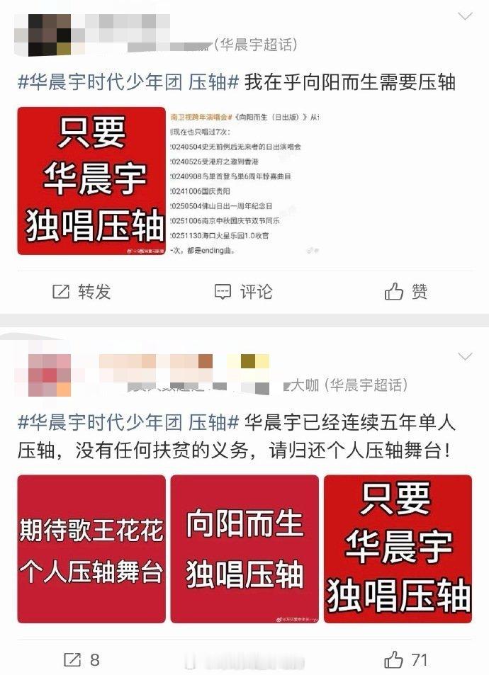 华晨宇 时团 湖南卫视跨年晚会咋回事?火星姐现在要求独唱压轴,表示已经连续五年华晨宇单人压轴了,今年也应该单人压轴华晨宇时代少年团 压轴