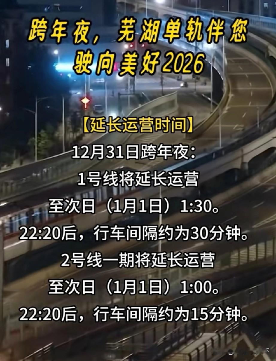 合肥地铁跨年夜通宵运营,芜湖单轨延长收班时间到凌晨1点半 今天是2025年12月31号,也是2025年的最后一天,明天就是2026年元旦。 安徽省的两大轨道交通城市,为了服务市民跨年夜出行,都做出了特别编排。 其中合肥地铁1.2.3.4.5.6.8号线,今晚通宵运营。 芜湖轨道交通公司消息,芜湖单轨1号线延长运营时间到凌晨1点半,晚上10点20分后,30分钟一班车。 芜湖单轨2号线延长运营时间到凌晨1点,晚上10点20分后,15分钟一班车。 合肥地铁,芜湖单轨,顺应市民需求,做出运营时间调整,让合肥和芜湖两个城市跨年夜活动,大家交通出行方便。合肥地铁 合肥地铁站台 合肥s1号地铁 地铁合肥南站 合肥一号线地铁 合肥跨年活动