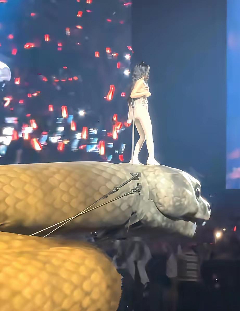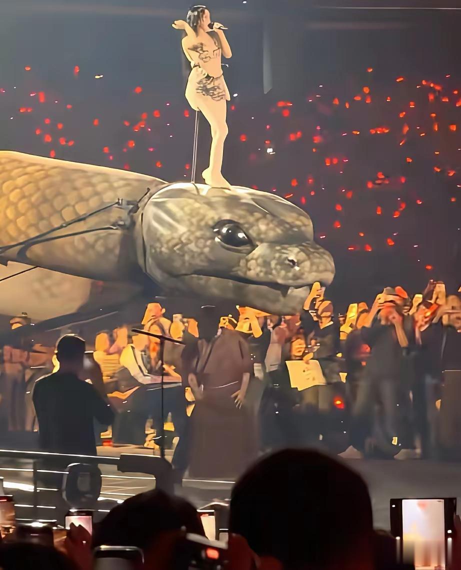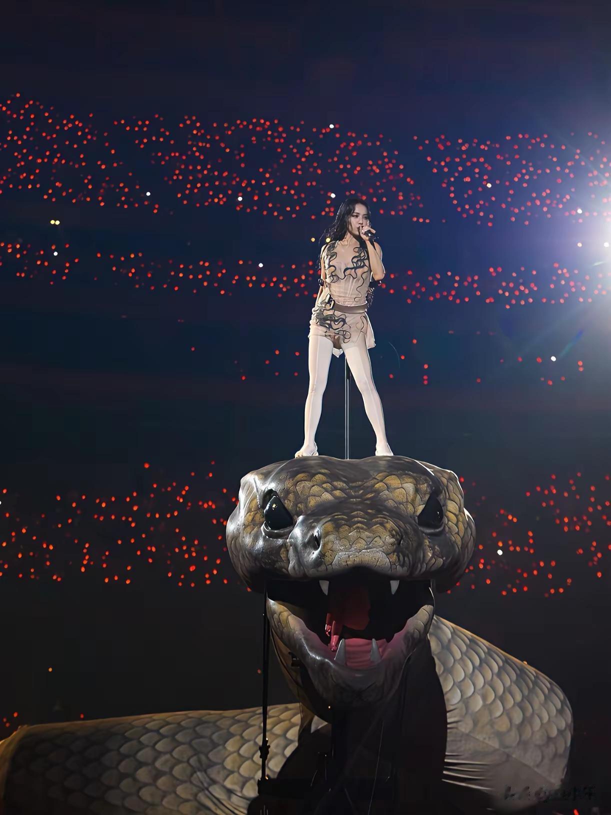 我敢说蔡依林的演唱会是国内史上最震撼演唱会。 别看人家身躯小,但是奈何不住人家胆子大,直接是站在了会张嘴的巨蟒上开演唱会,还别说这巨蟒在灯光的照射下显得栩栩如生。 也比较佩服蔡依林的胆子真大,站在巨蟒头顶上的她,那可是气场全开,更像是美杜莎复活一般,不仅仅有巨蟒,还有3米高的巨型公牛。大蛇和巨牛的登场,也是让现场气氛直接送上高潮。 不得不说这么帅气的演唱会,这制作的成本也不低,据说为了这场演唱会的制作,可是投入了大概9亿的新台币,换算成人民币也要有2亿9百万的。
