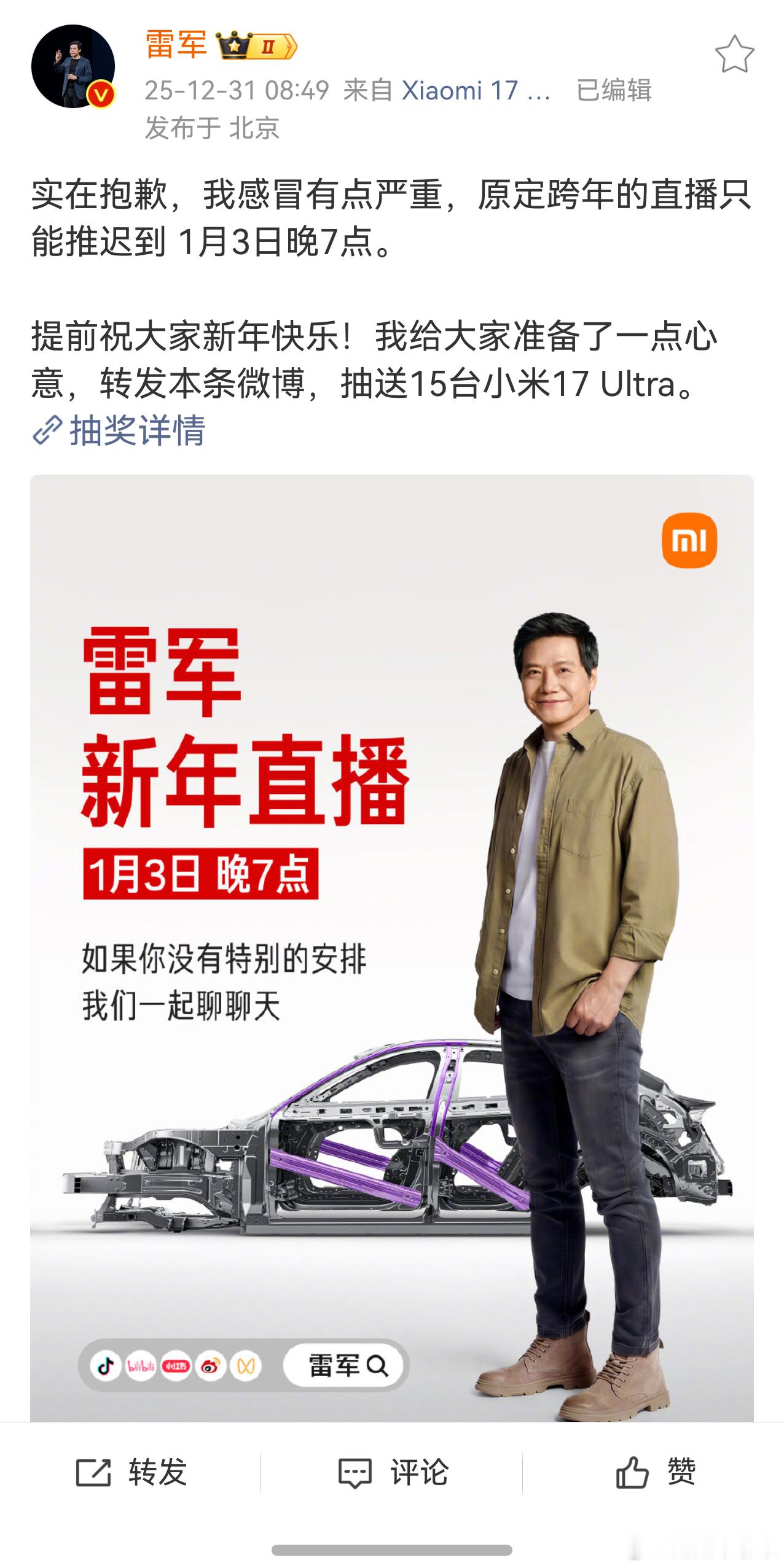 雷军新年礼物抽奖送手机 这次的直播间会有多少人看啊,觉得比的直播会多的多吧