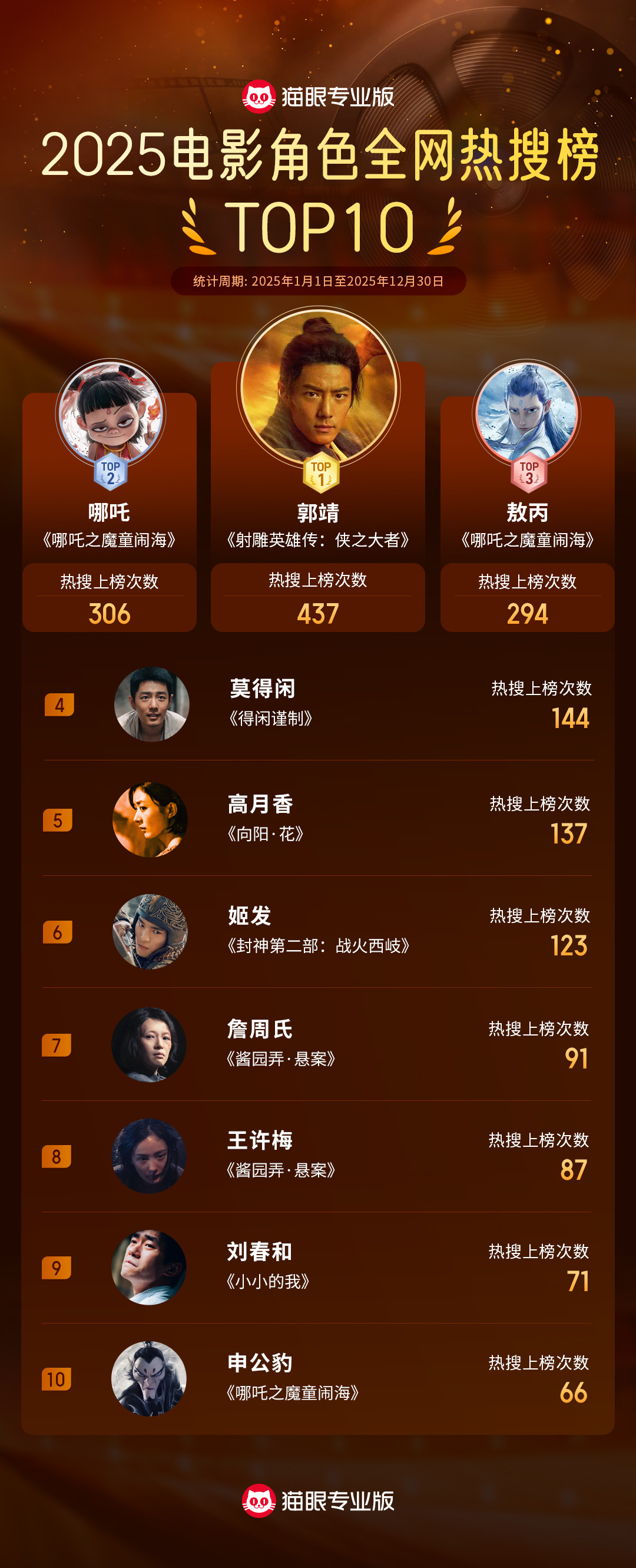 2025年全网热搜榜猫眼专业版2025电影角色全网热搜榜发布冠军:在《射雕英雄传:侠之大者》中饰演的“郭靖” 肖战郭靖年度电影角色全网热搜冠军亚军:《哪吒之魔童闹海》“哪吒”季军:《哪吒之魔童闹海》“敖丙”数据统计范围:2025年1月1日-12月30日期间有过热搜的电影2025你的院线电影最佳2025年度猫眼榜单