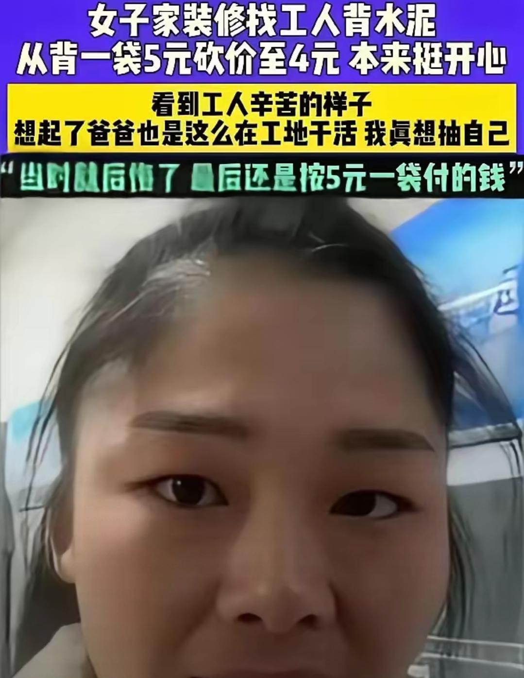 河南大姐补钱那一下,才懂:真正的体面,从不对靠力气吃饭的人抠门! 砍价本是生活常态,可对着白发苍苍的老人,把5块一袋的水泥压到4块,看着他扛着五十公斤重物爬五楼,三十袋扛完手都在抖,那点差价早变成了心里的疙瘩。 她掏200块塞过去的瞬间,补的不只是钱,是对劳动的尊重,是把被精明磨淡的人情味捡了回来。 很多人总觉得体力活“不值钱”,却忘了每一分都是用汗水换的,对劳动者的善意,从不是慈善,是做人的底线。 你遇到过靠力气谋生的劳动者吗?当时有没有多一份体谅?