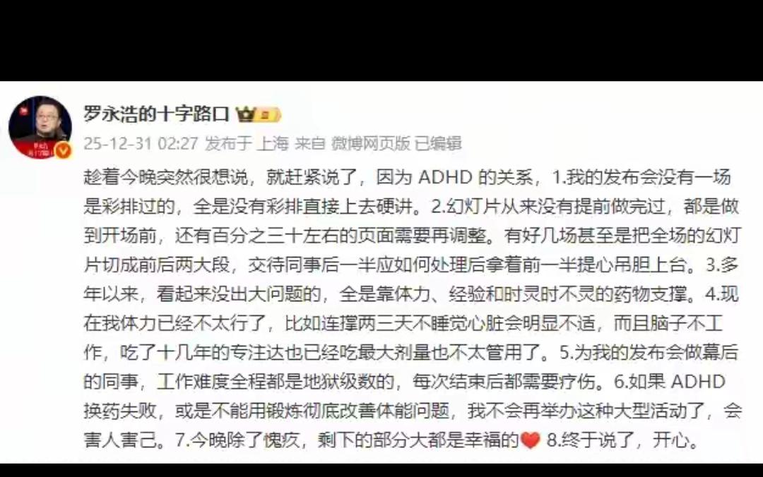 罗永浩自曝ADHD这波,才懂:真正的真诚,是不把“缺陷”包装成人设! “科技春晚”迟到40多分钟引群嘲,他没找借口,反而凌晨坦白多年被注意力调节失灵困扰——发布会从不彩排,幻灯片开场前还没做完,全靠体力和药物硬撑。 现在药物失效、体能下滑,他直言“不想害人害己”,甚至给观众全额退款,这份坦诚比完美公关更打动人。 比起把心理困境当营销素材的操作,他不回避问题、主动担责的样子,才是公众人物该有的态度。 我们总习惯要求他人完美,可谁还没点难言之隐? 你怎么看待公众人物公开自身健康问题?